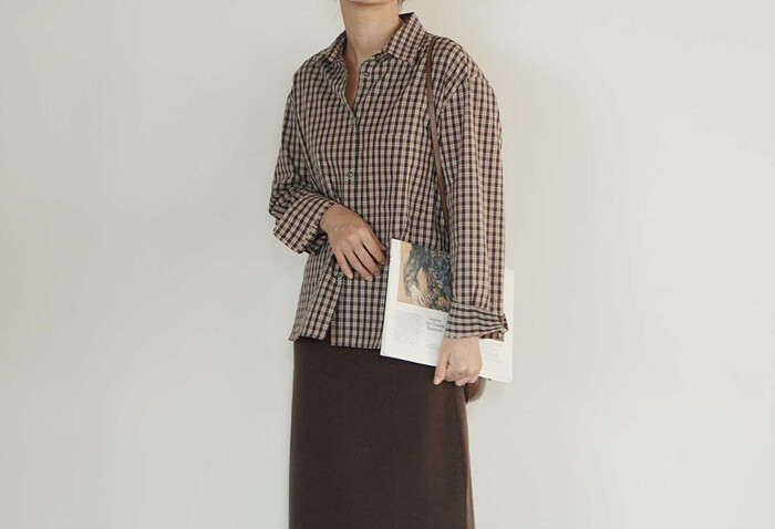 네이비, 브라운 컬러가 어루러진 체크 패턴으로