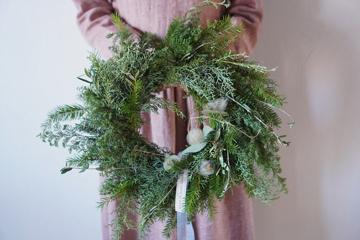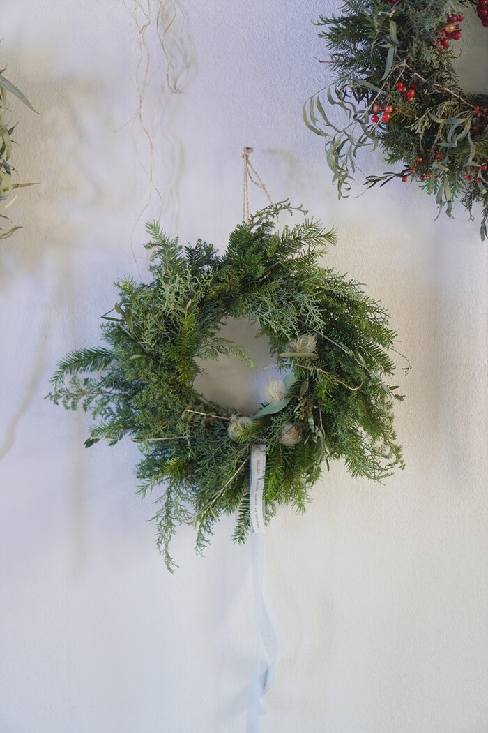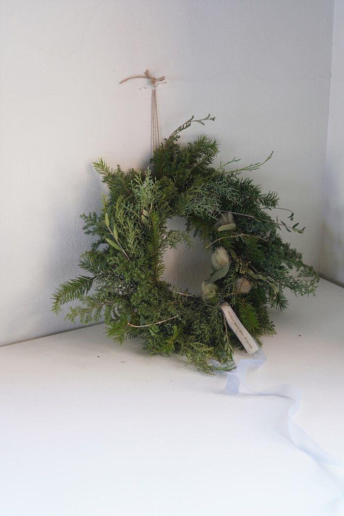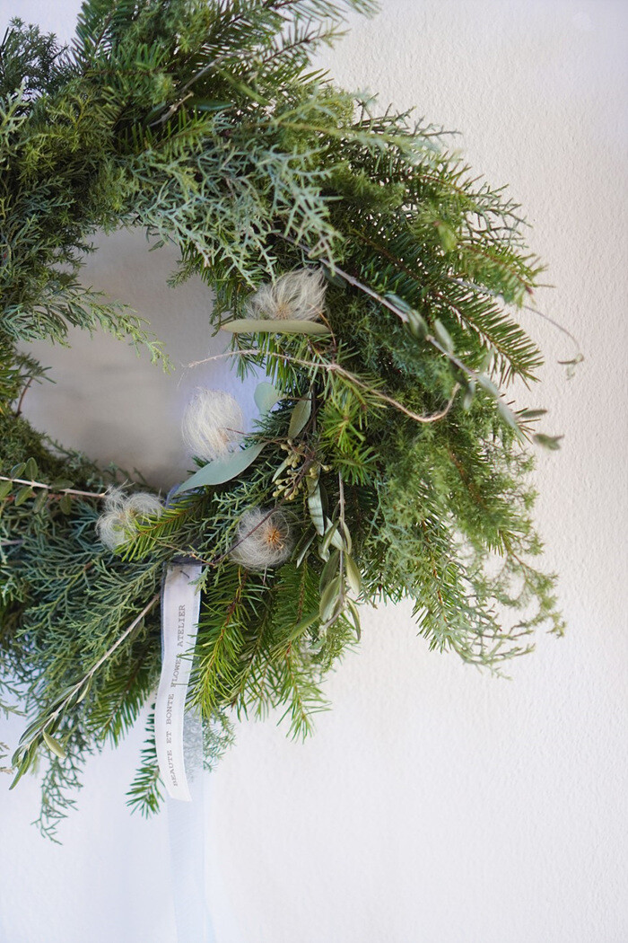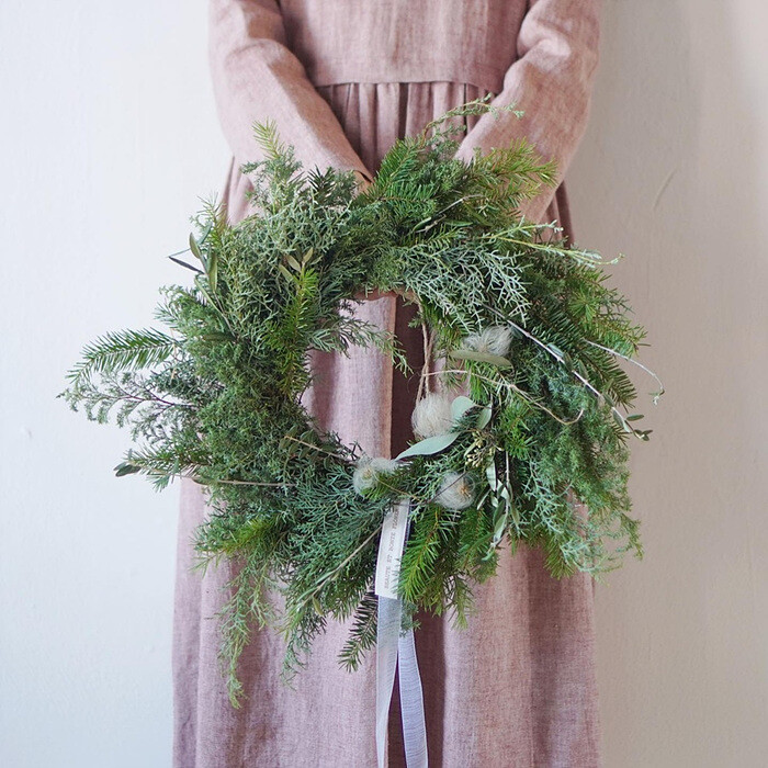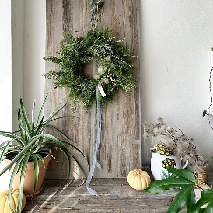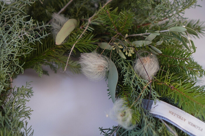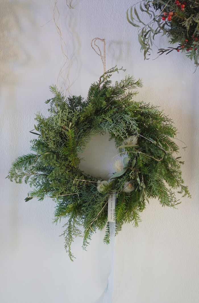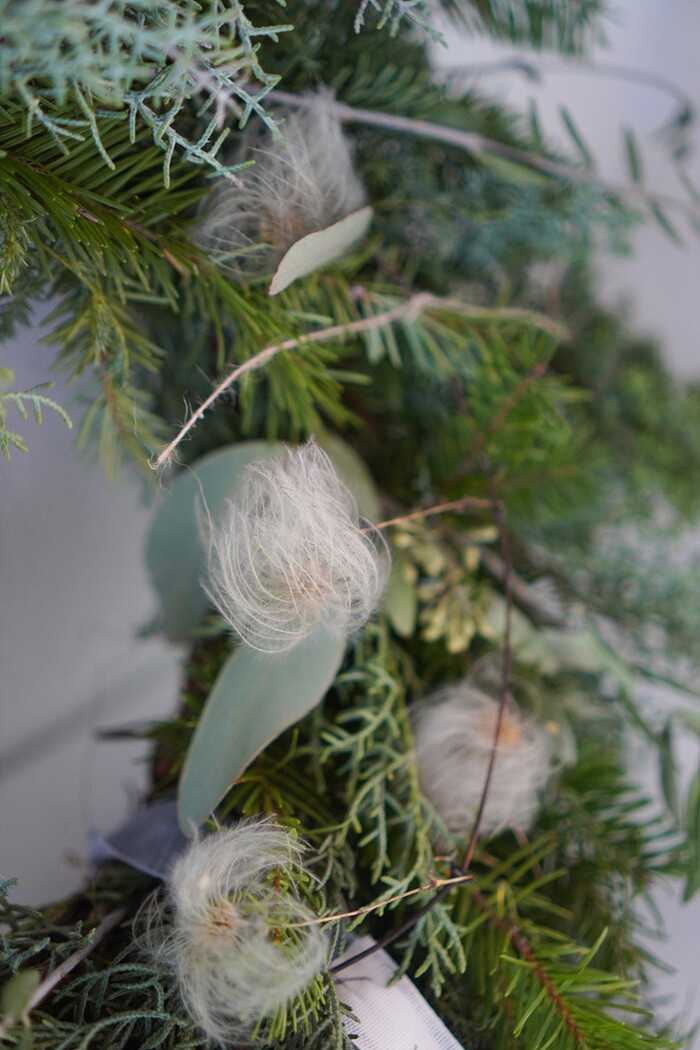 차분한 그린의 침엽수에 클레마티스 시드가 더해진 리스로,