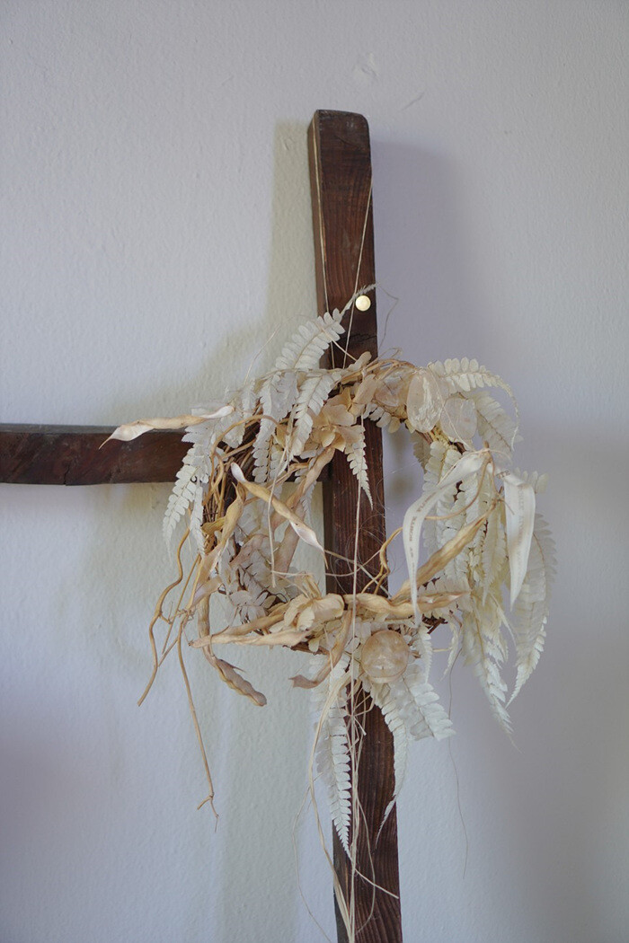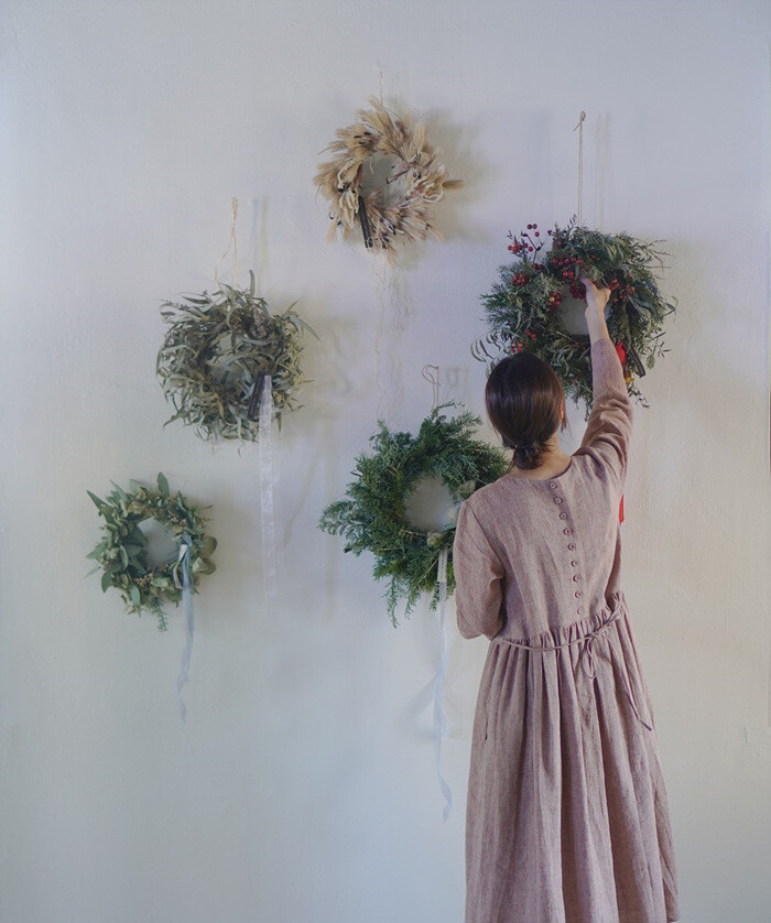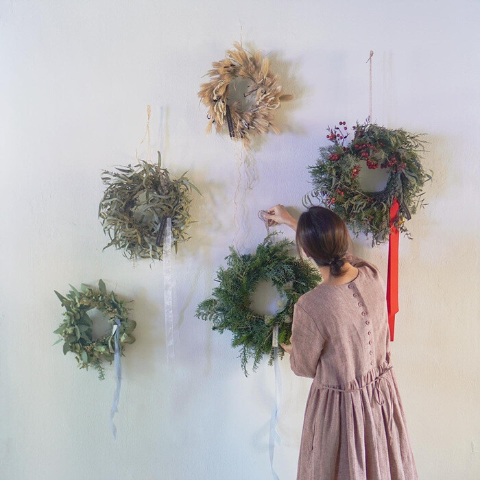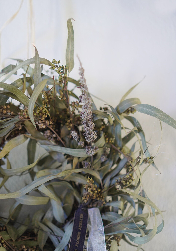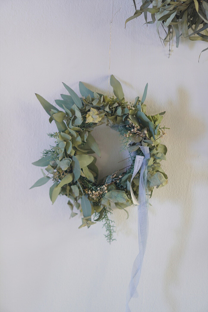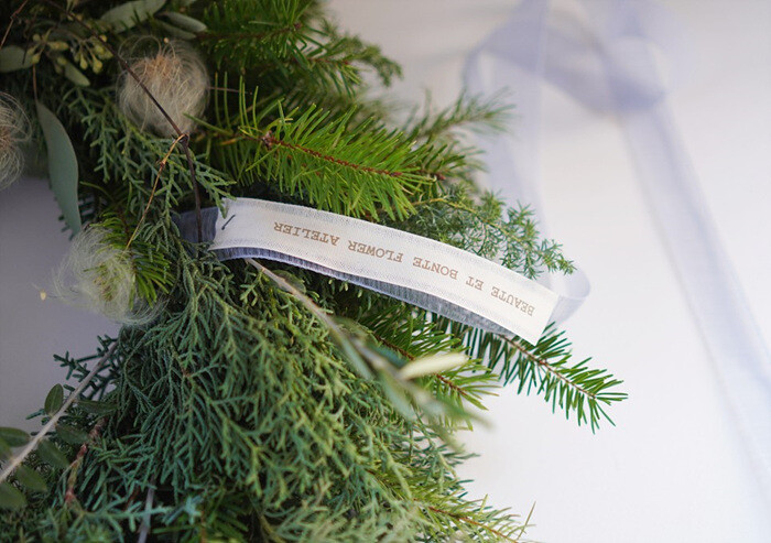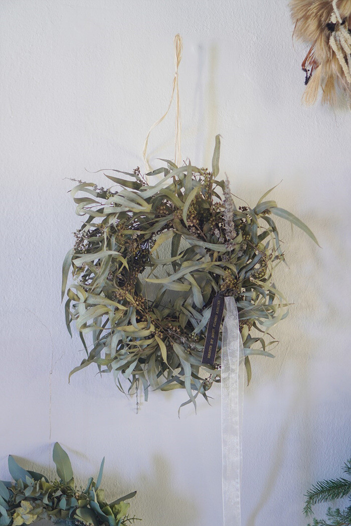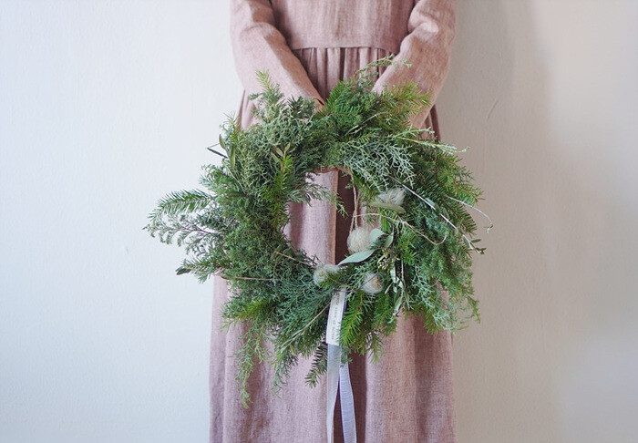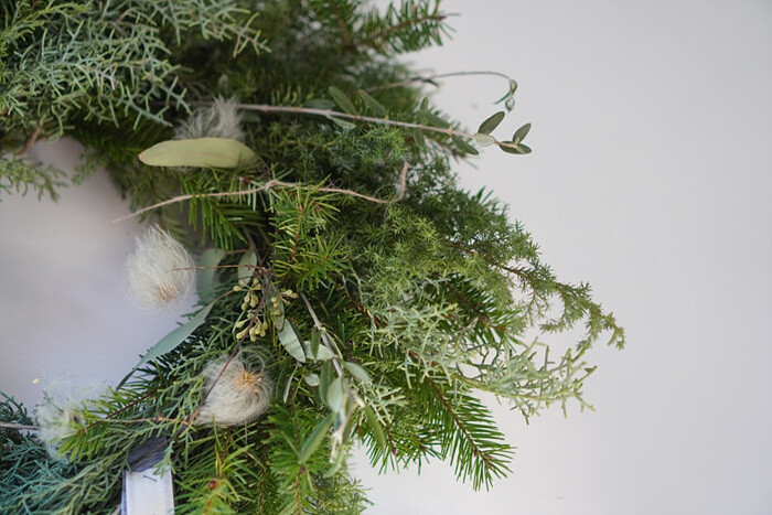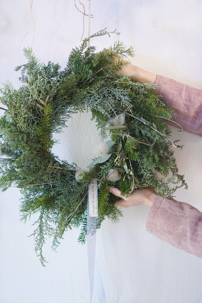 차분한 그린의 침엽수에 클레마티스 시드가 더해진 리스로,