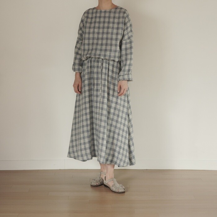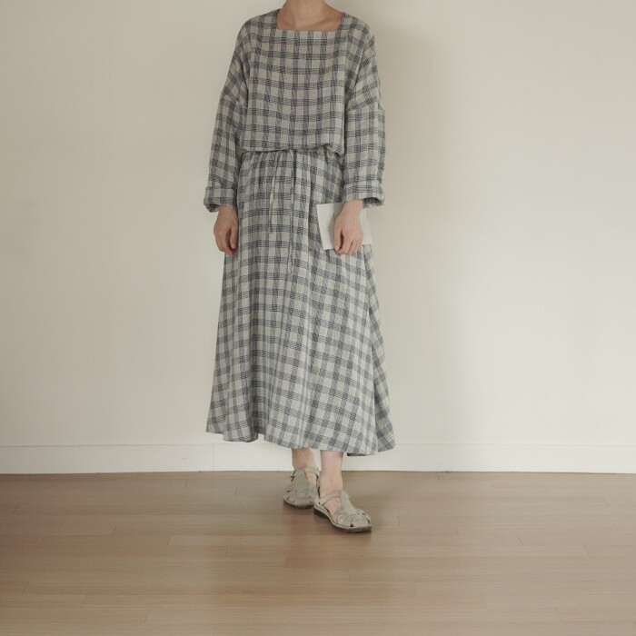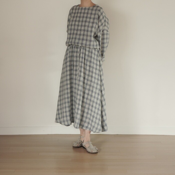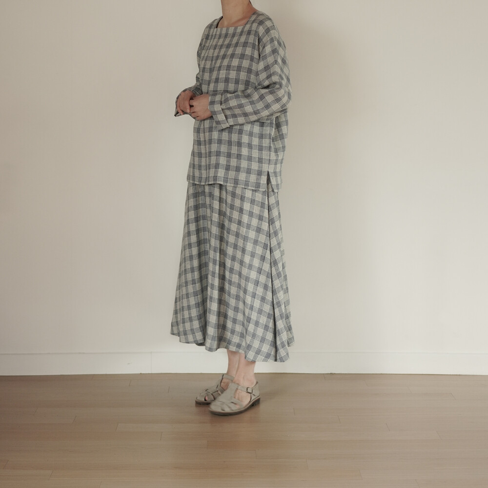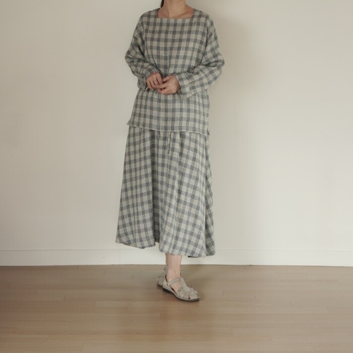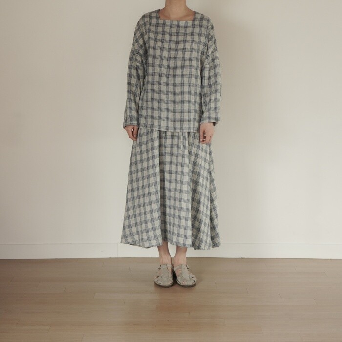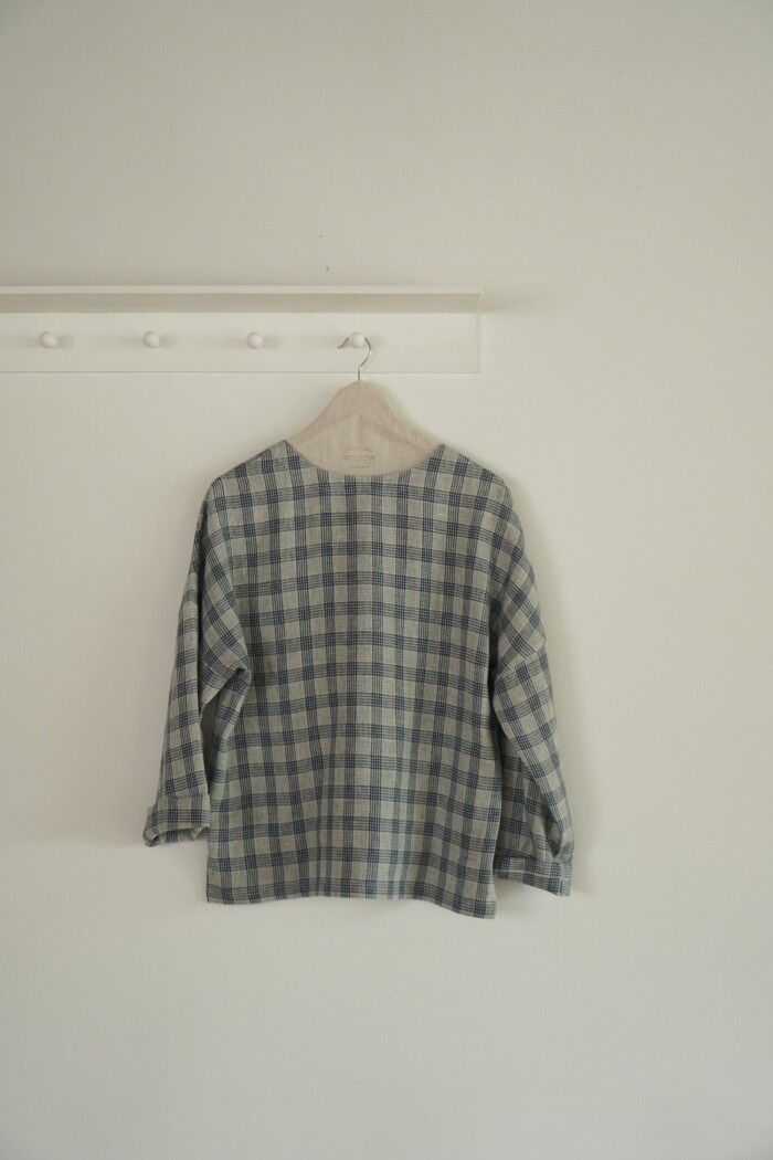 옅은 아이보리 위에 시원한 블루빛의 체크가 직조된 리넨 소재로,
