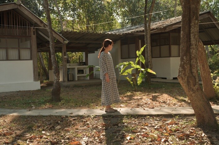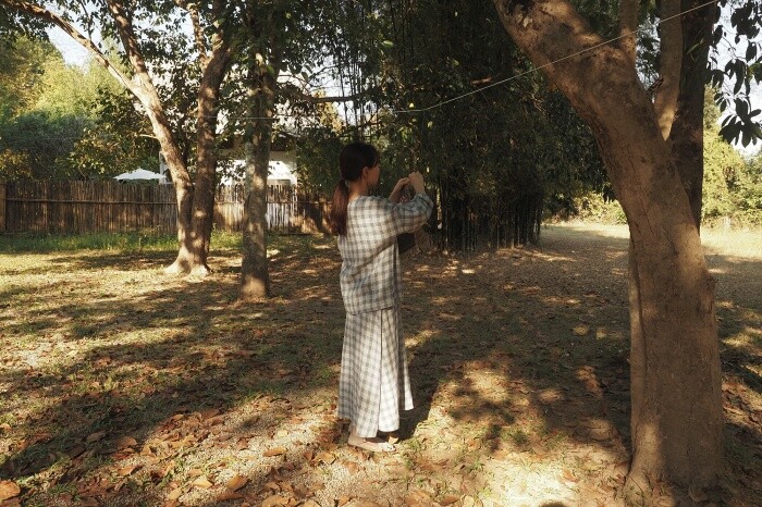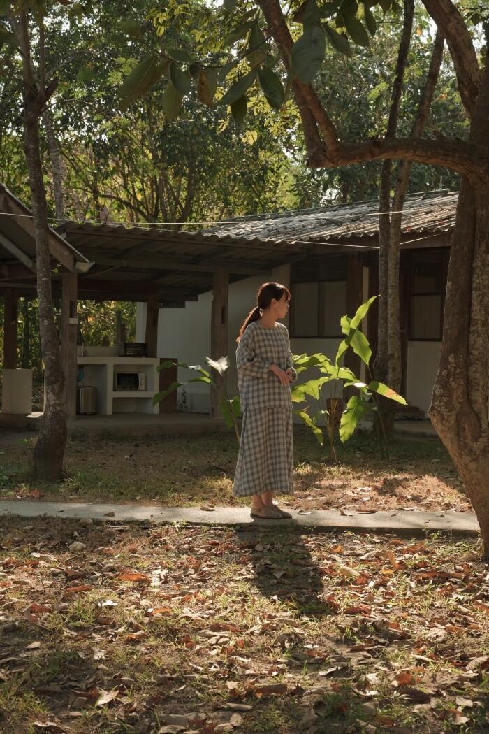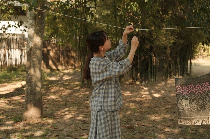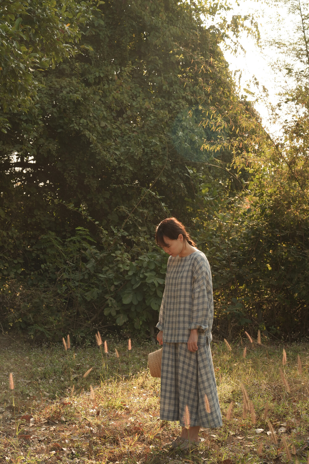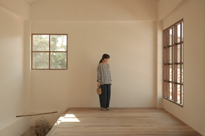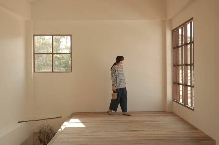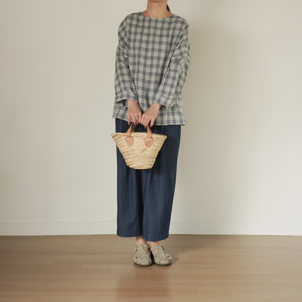 옅은 아이보리 위에 시원한 블루빛의 체크가 직조된 리넨 소재로,