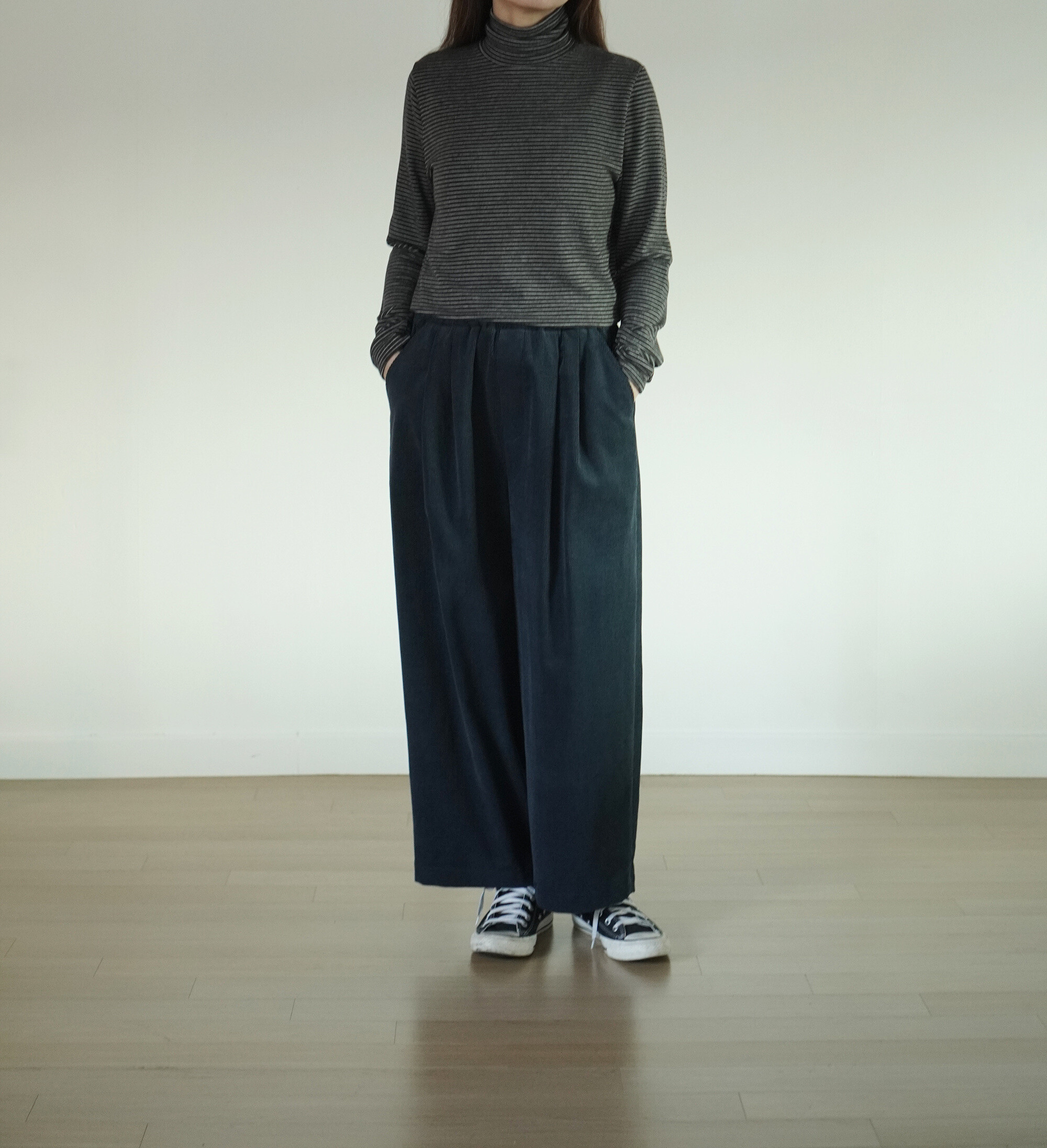차콜컬러의 스트라이프목티와 함께.