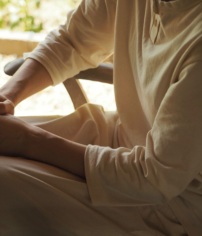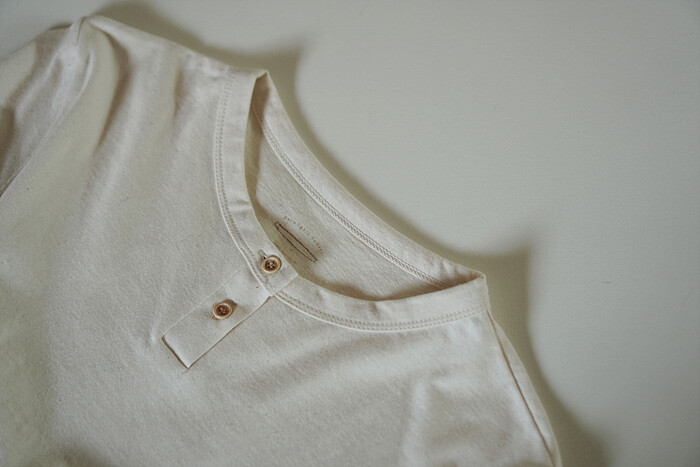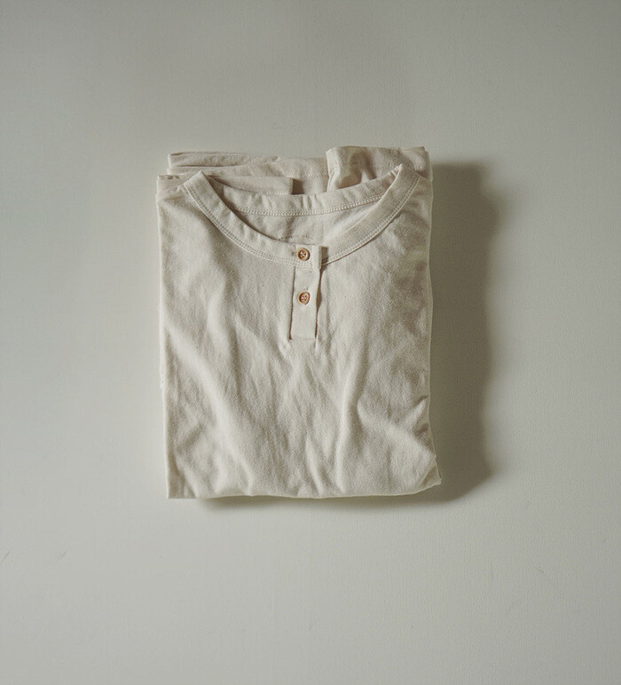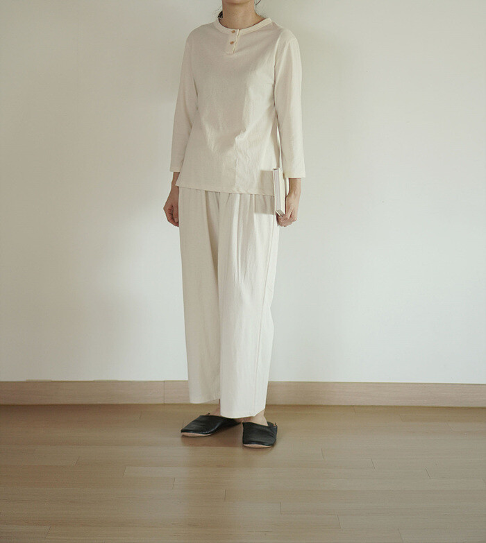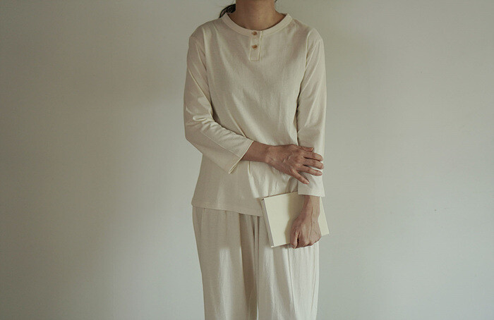 제원단을 감싸 마무리한 편안한 핏의 라운드 넥에