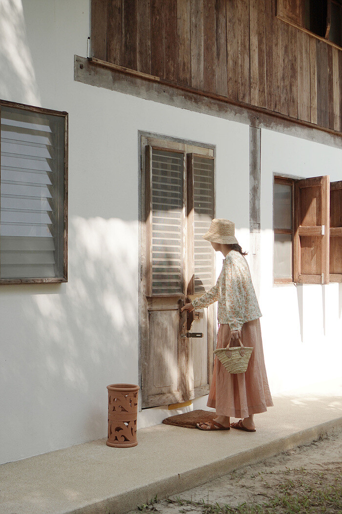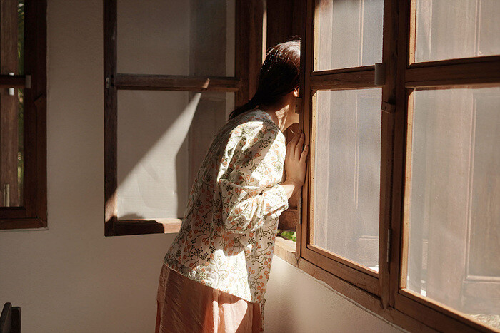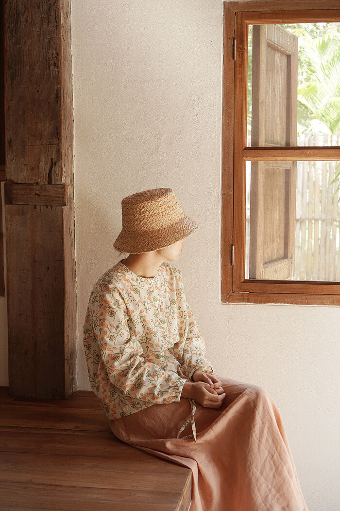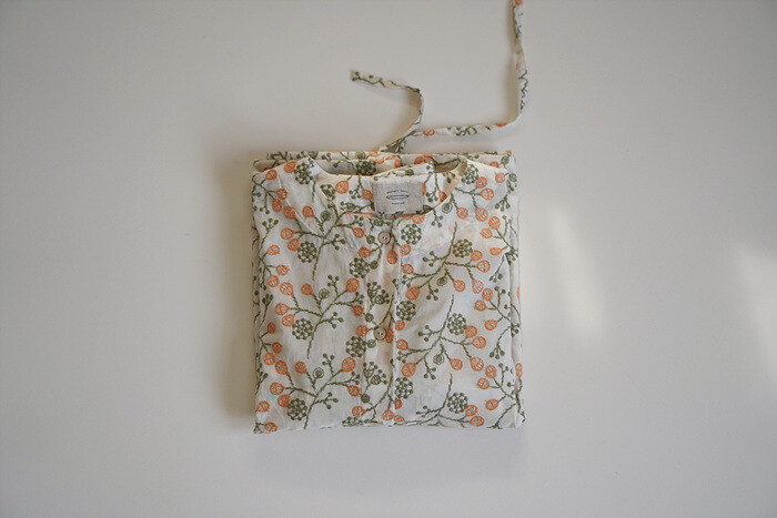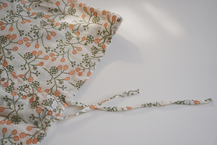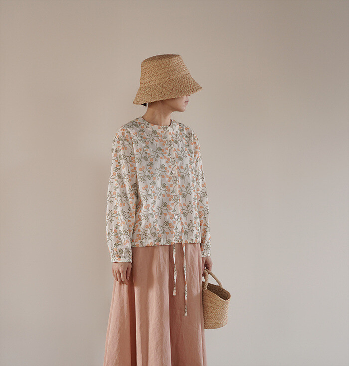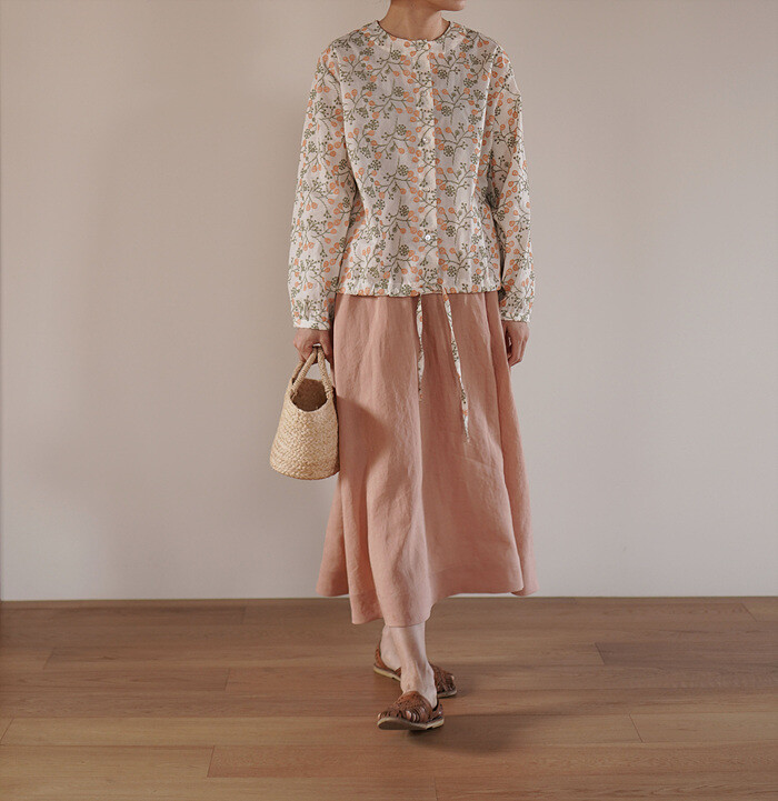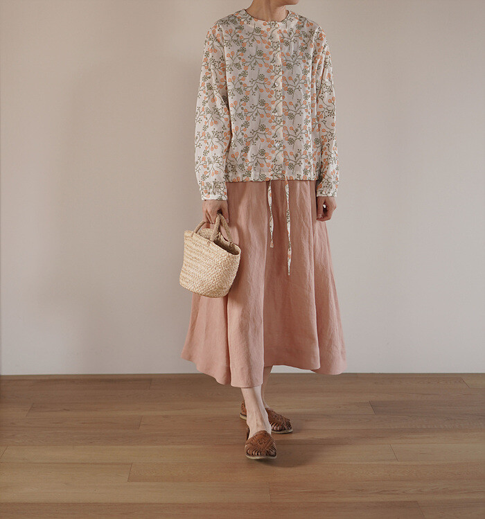 허리끈을 리본을 묶어 밑단이 살짝 블라우징되도록