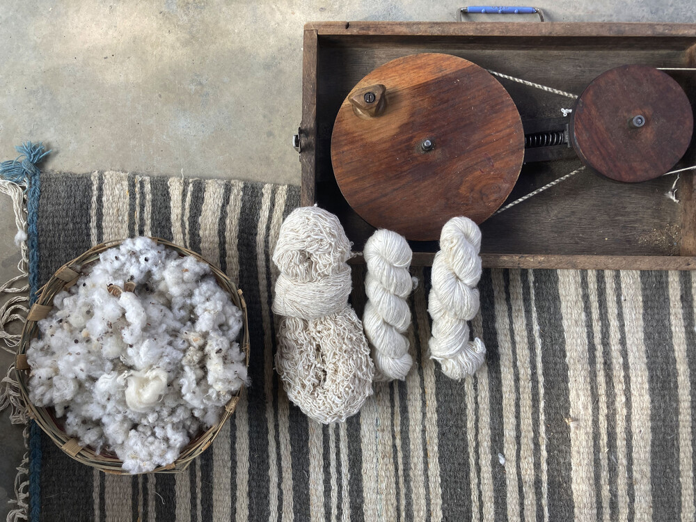 작은 상자에 담긴 물레를 이용해 손으로 실을 뽑고,