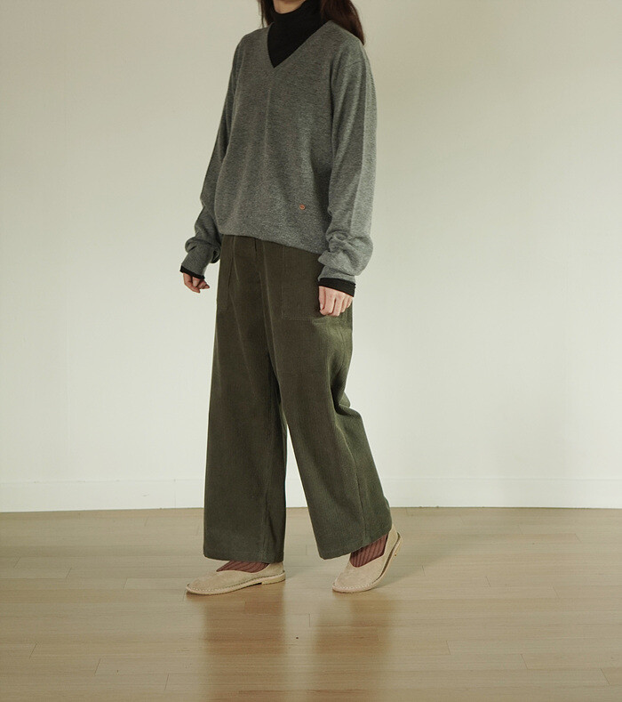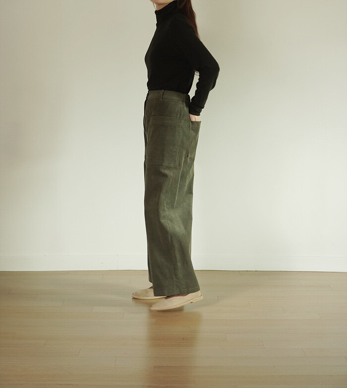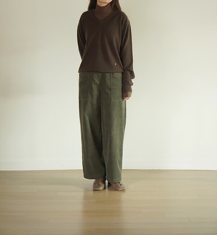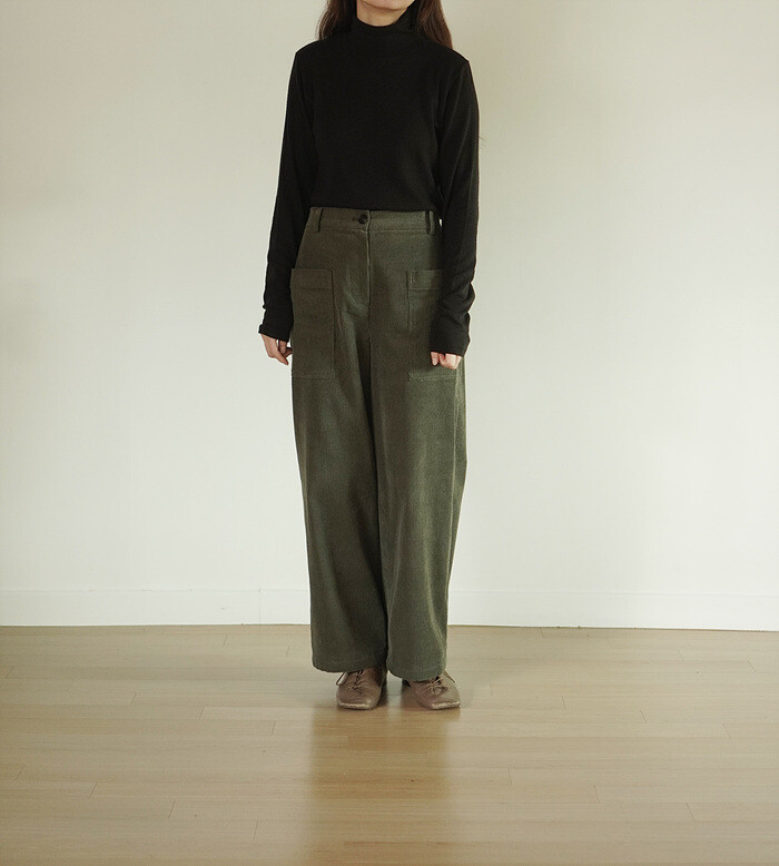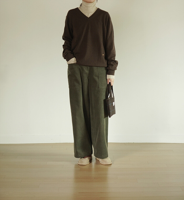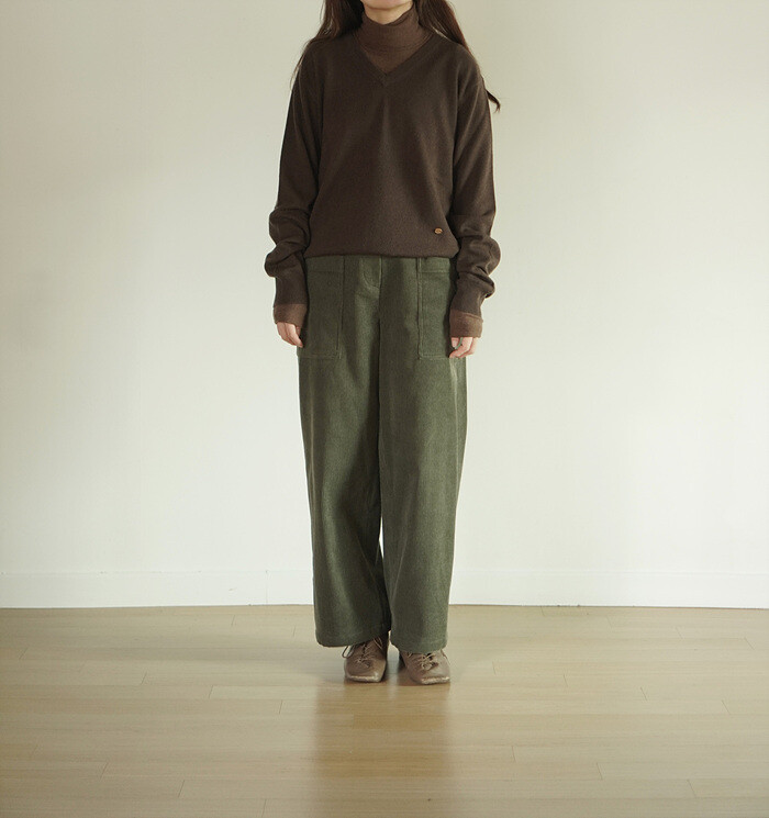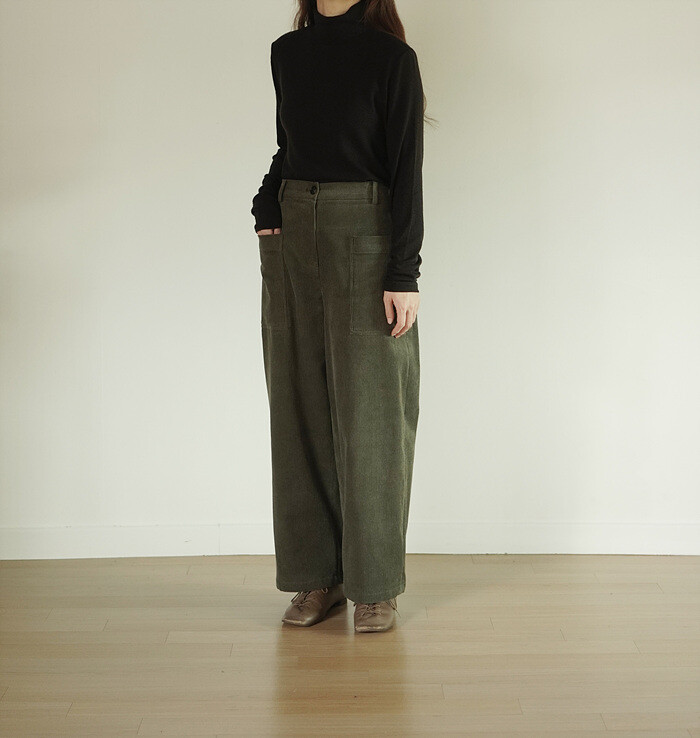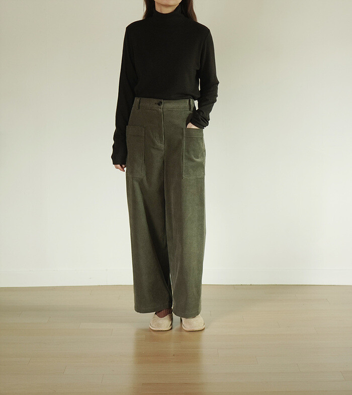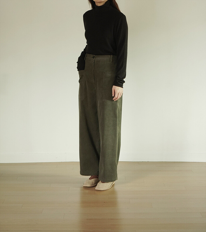 Deep olive 컬러의 포켓 코듀로이 팬츠와