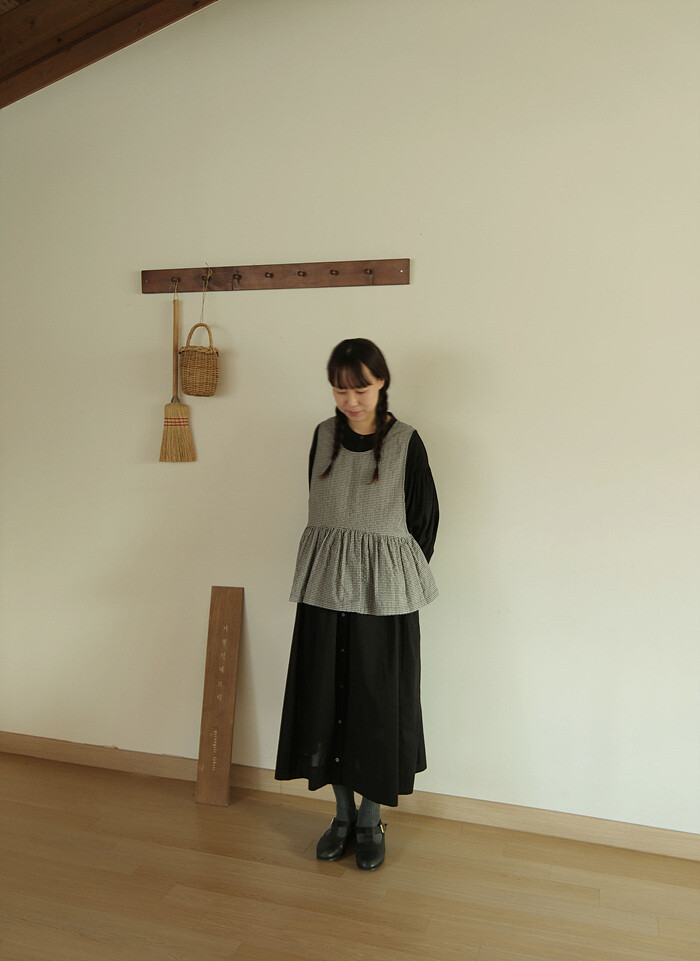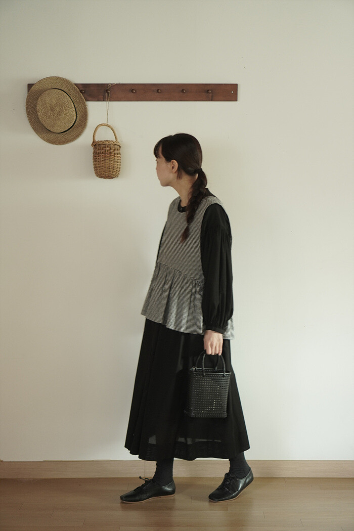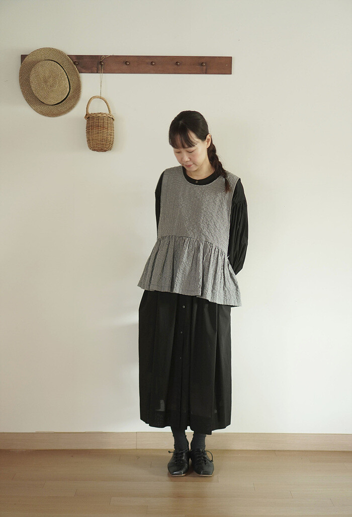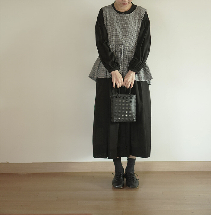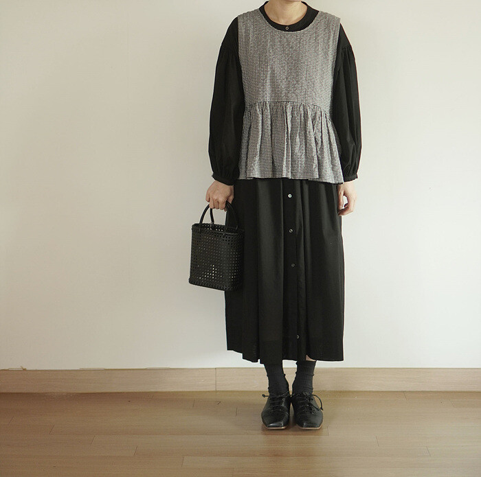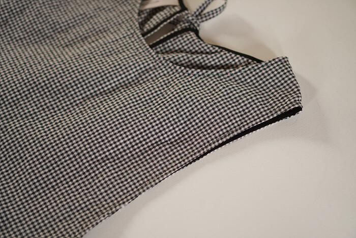 넥라인 , 암홀은 블랙 컬러로 인사이드 바이어스 처리 되었습니다