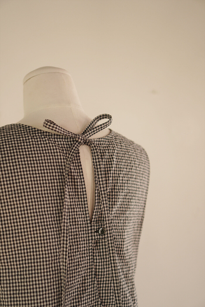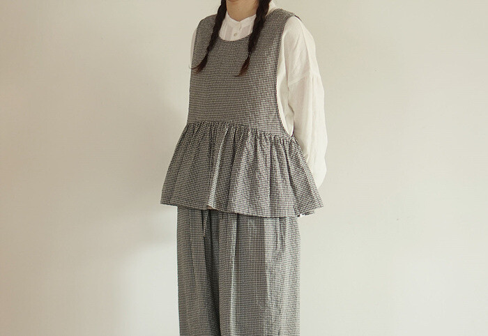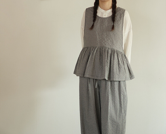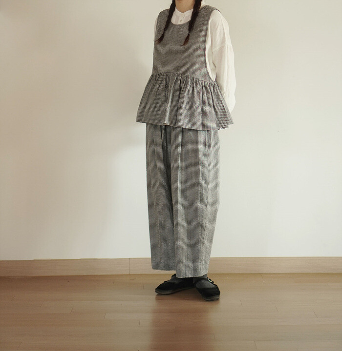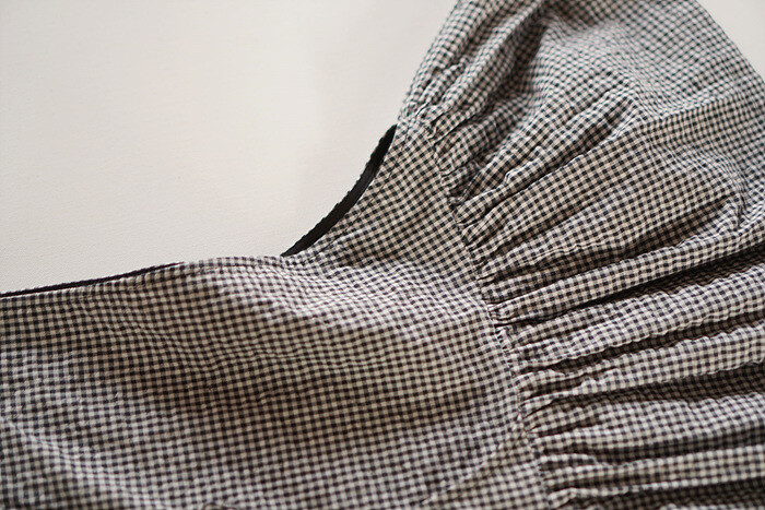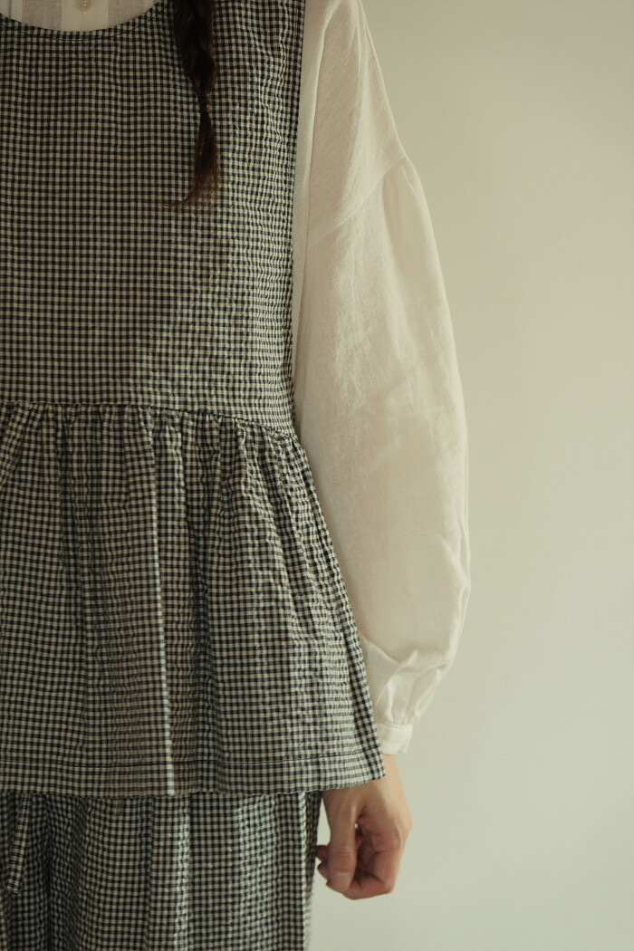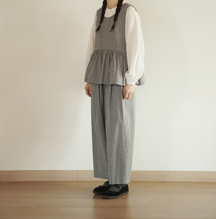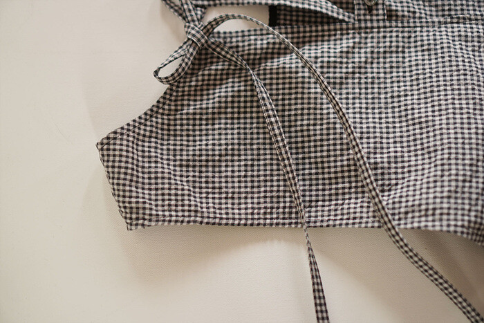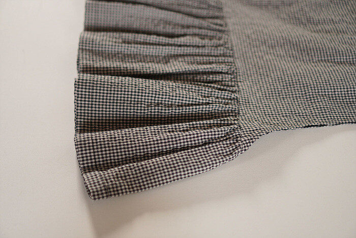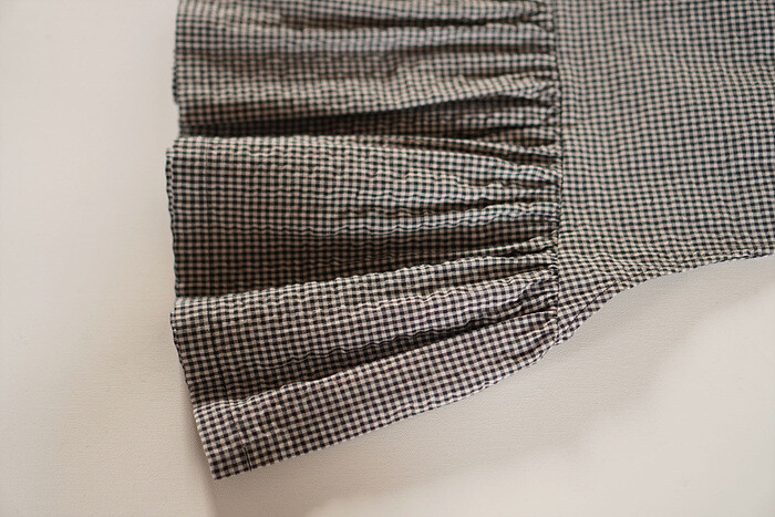잔잔한 깅엄체크 패턴과 시어서커 조직의 미세한 표면감이 어우러졌습니다.