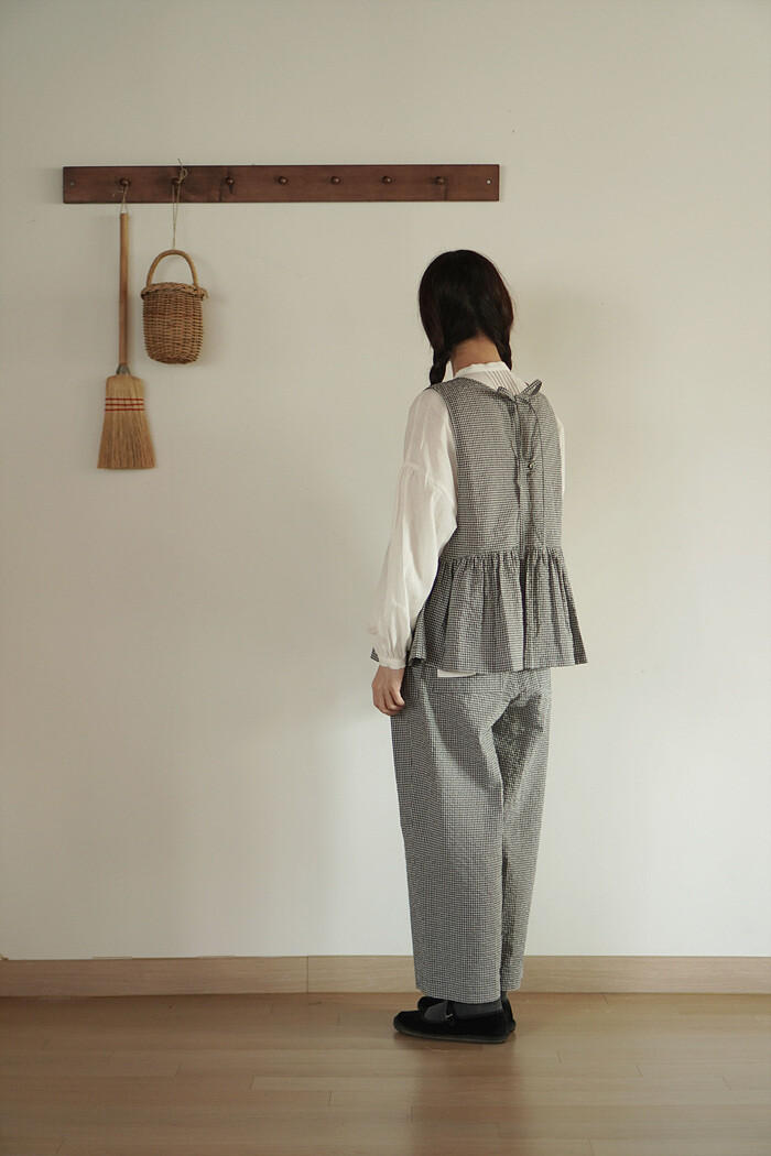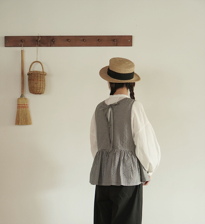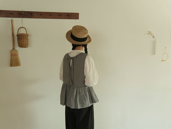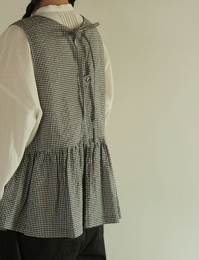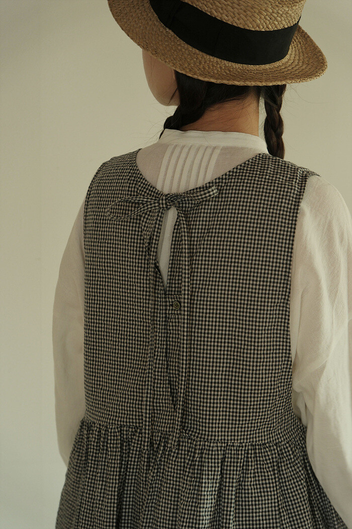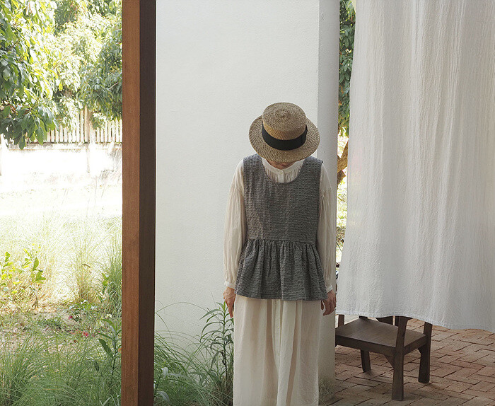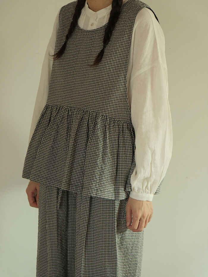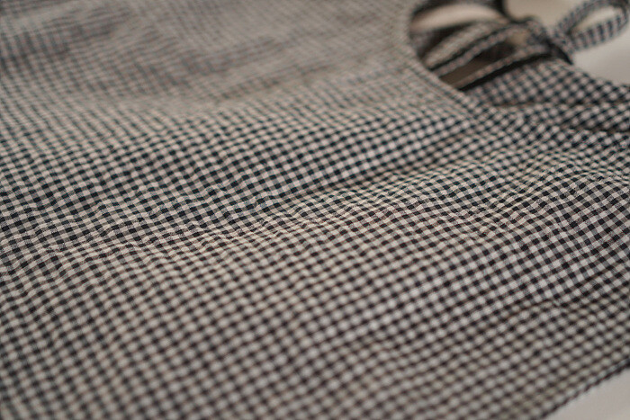 잔잔한 깅엄체크 패턴과 시어서커 조직의 미세한 표면감이 어우러졌습니다.
