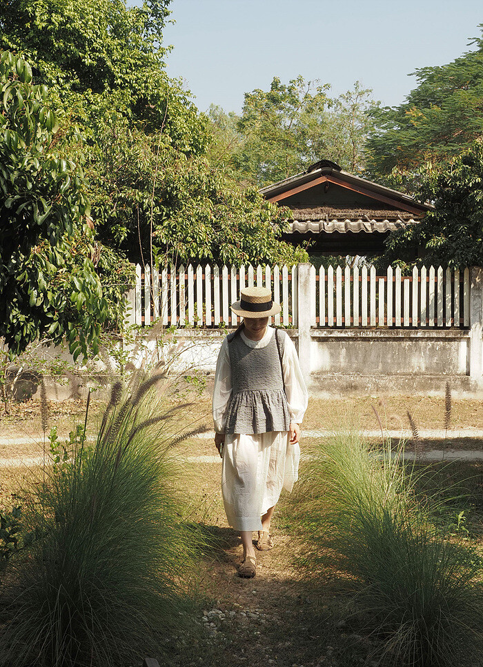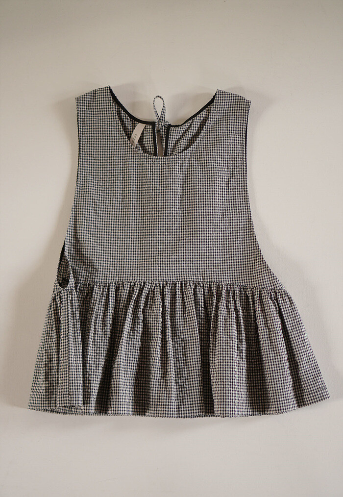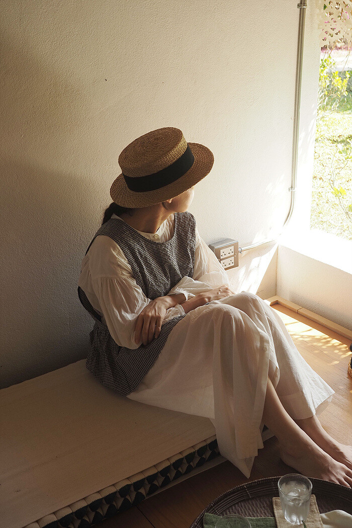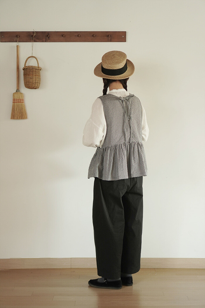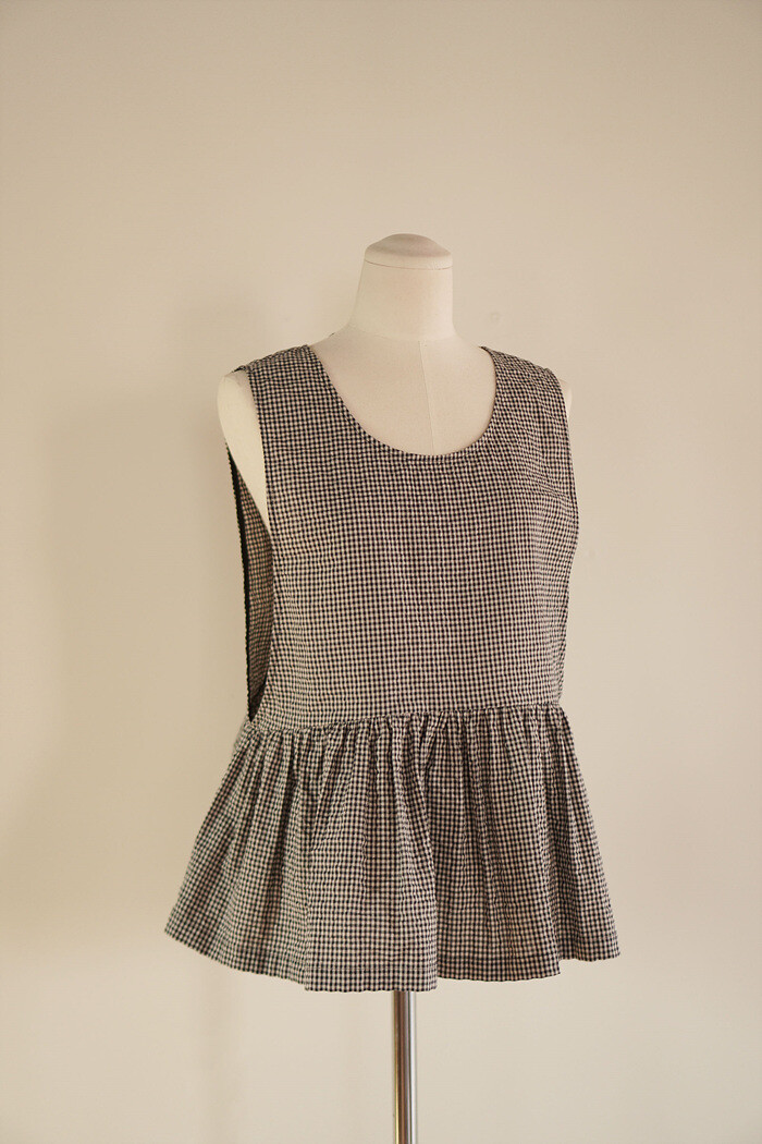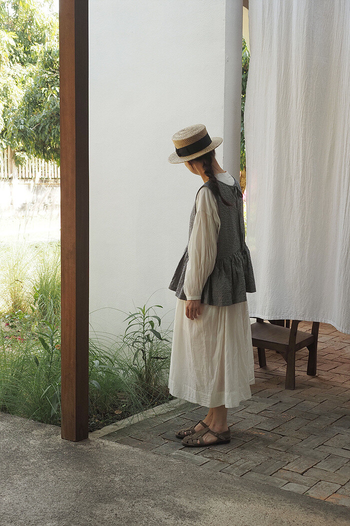 잔잔한 깅엄체크 패턴과 시어서커 조직의 미세한 표면감이 어우러졌습니다.