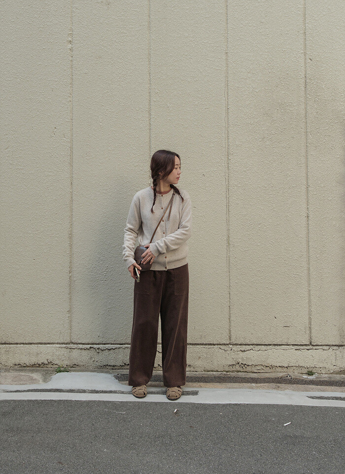 브라운 컬러의 코듀로이 팬츠와 함께.