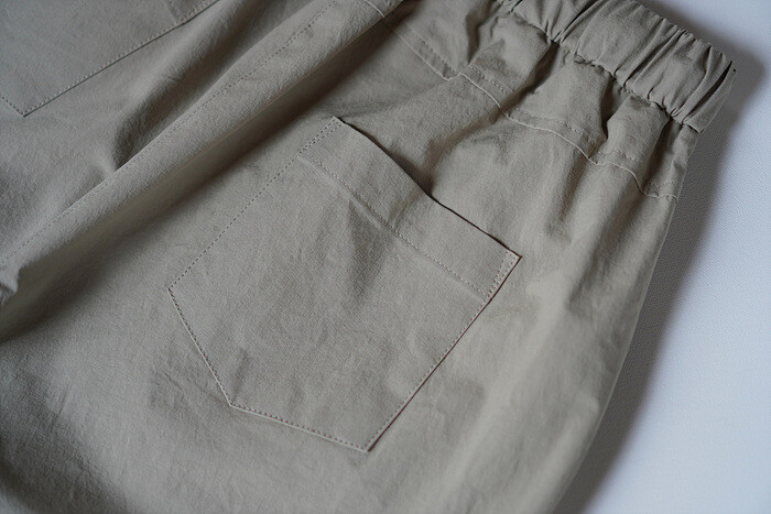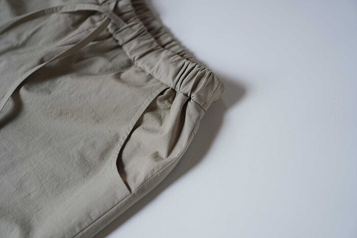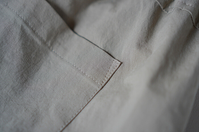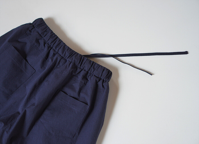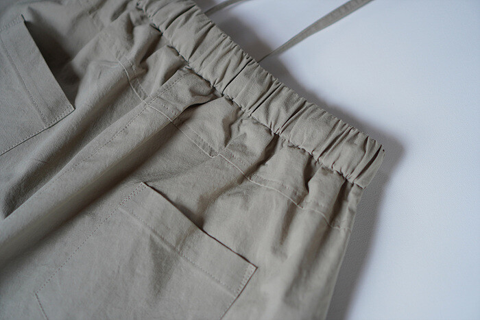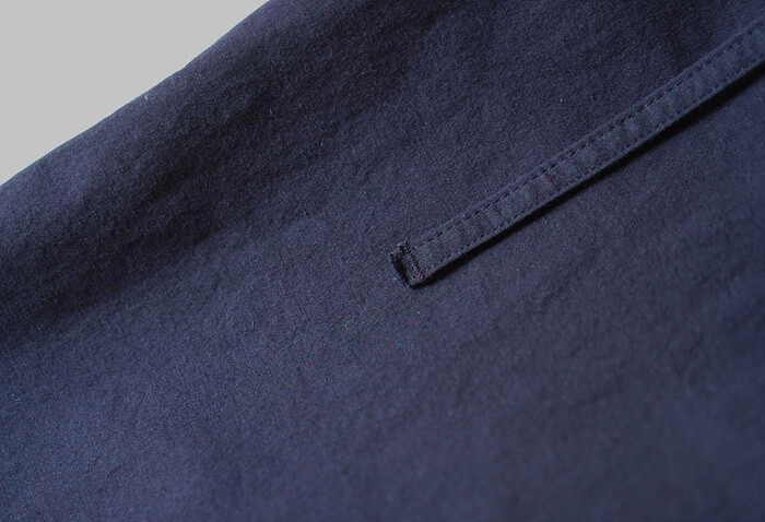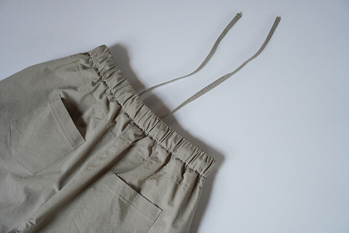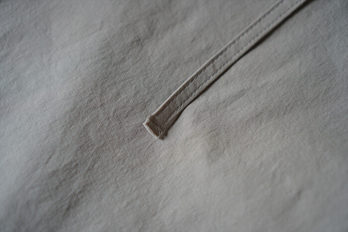 허리끈의 끝처리는 raw edge + bar tack 장식으로 마무리 되어 있으며