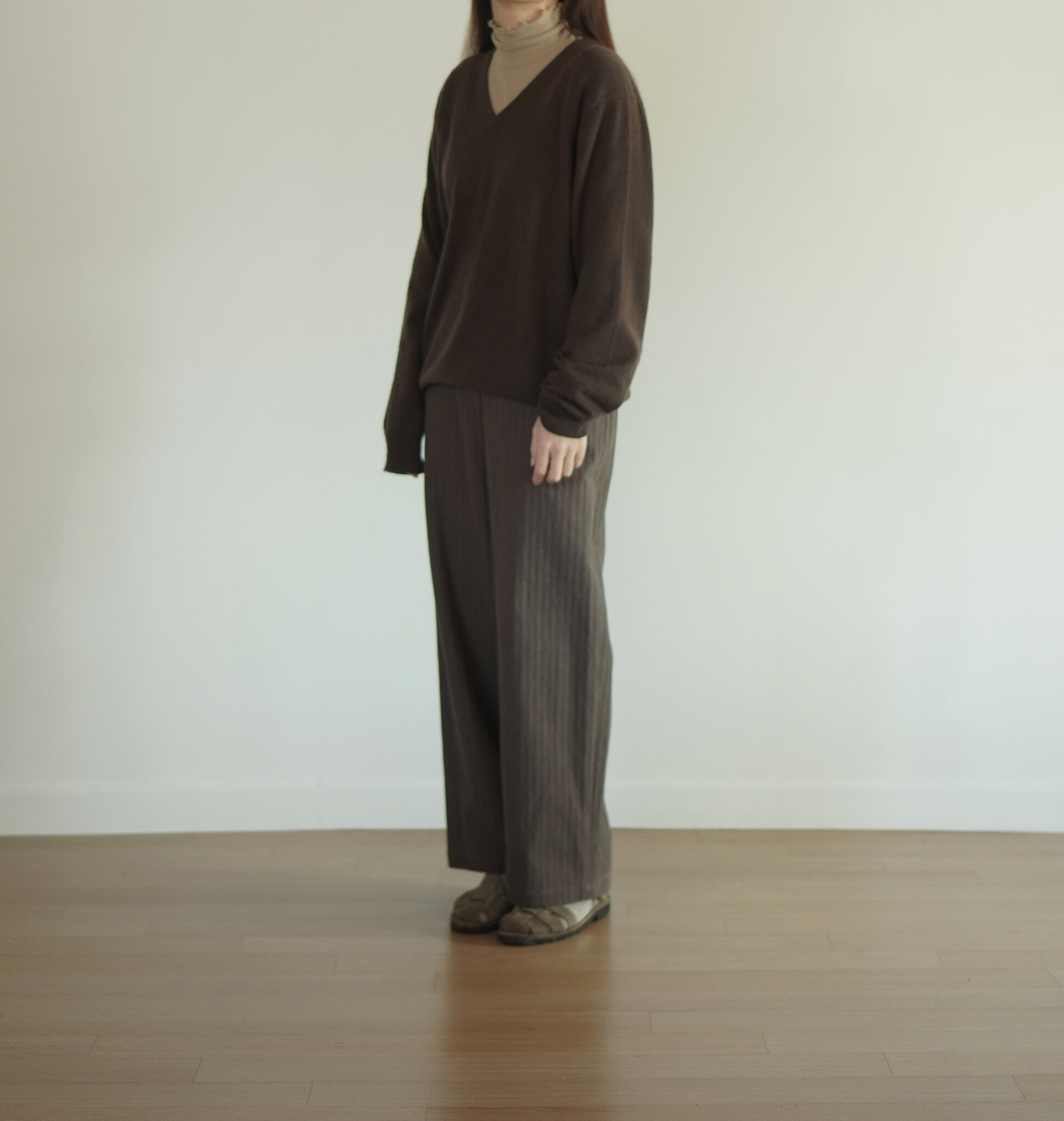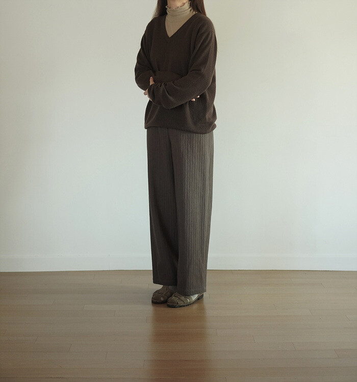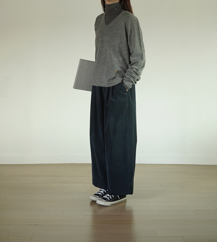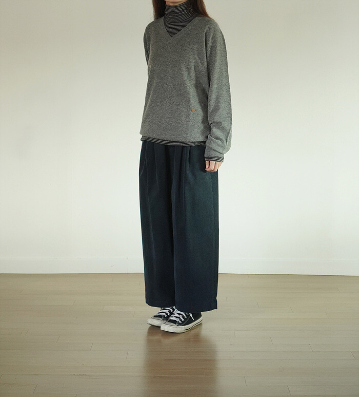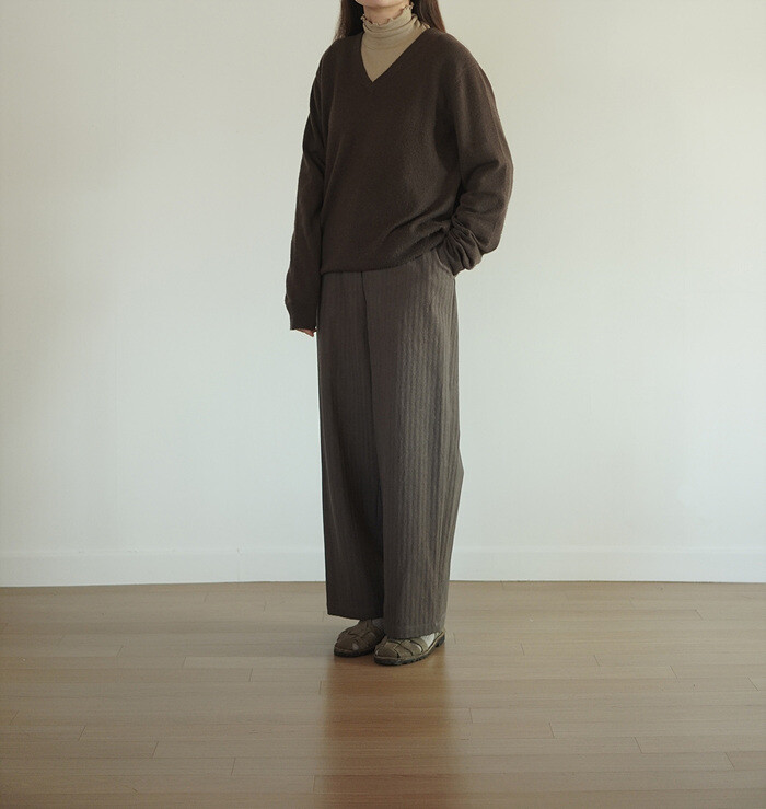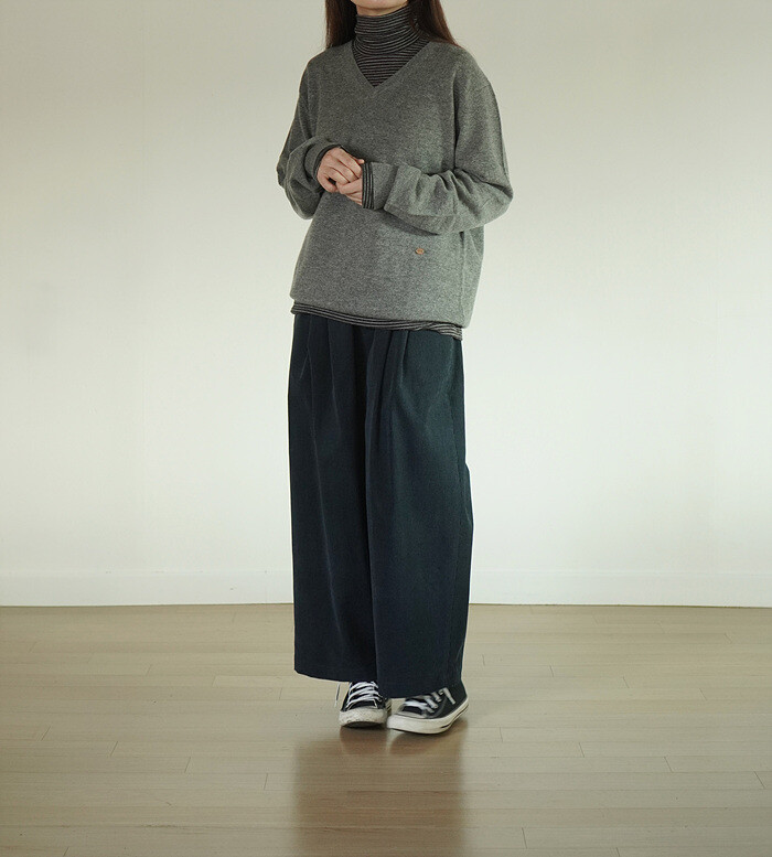 바지와도 잘 어울리는 v넥 풀오버 입니다.