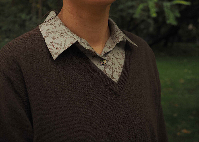 아주 깊지 않은 v넥으로 단독으로 입어도