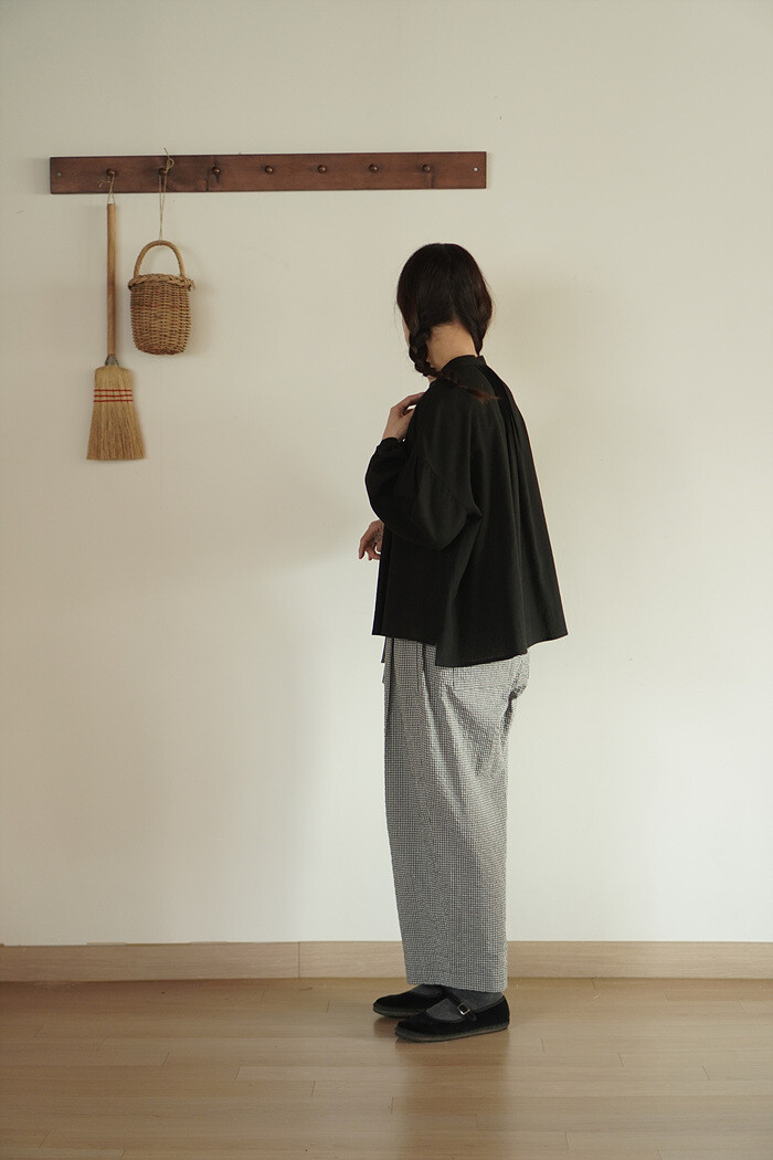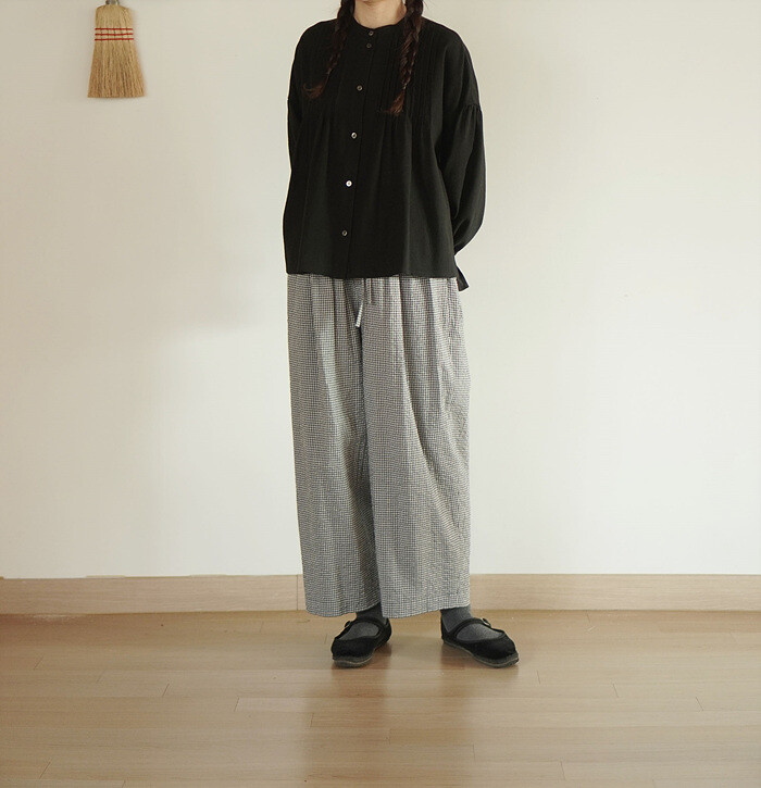 고방 체크 패턴의 박시 팬츠와 함께 착용했습니다