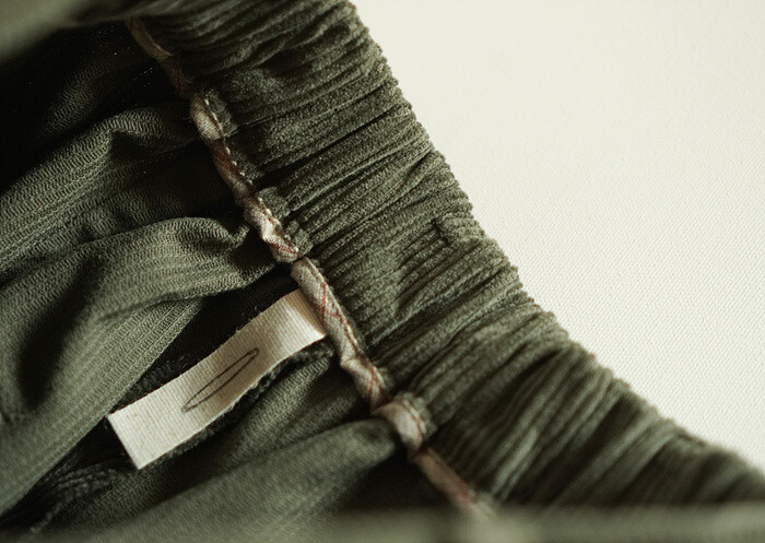 허릿단의 시접은 체크 소재로 배색 바이어스 마감하였습니다.