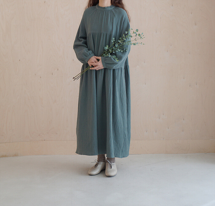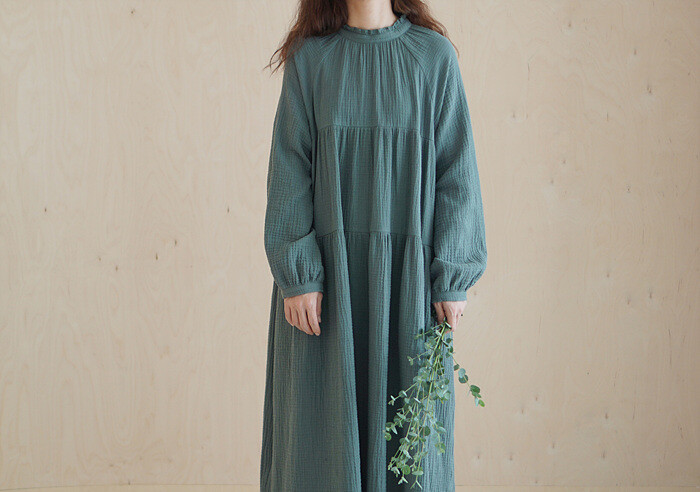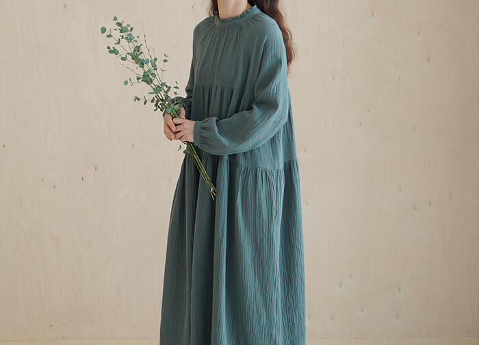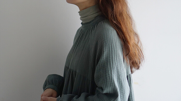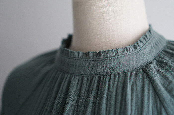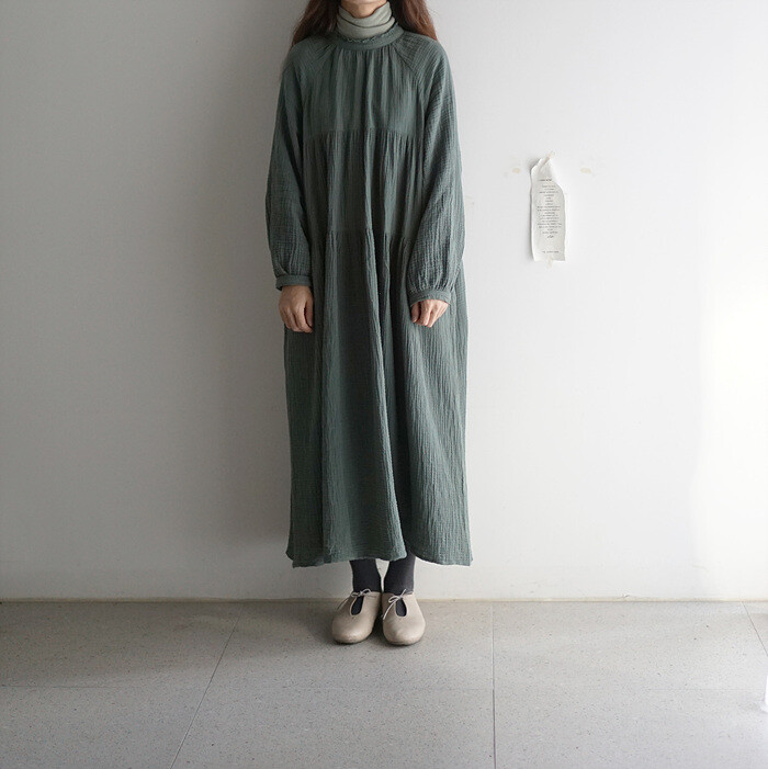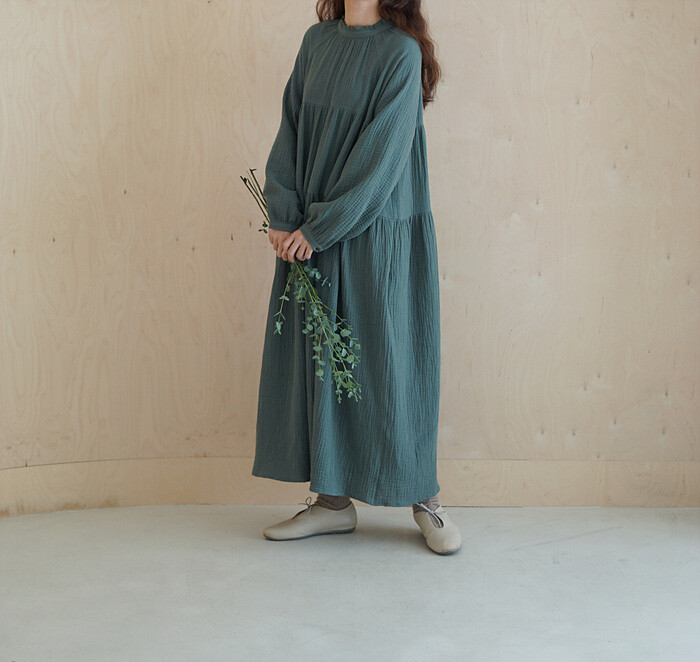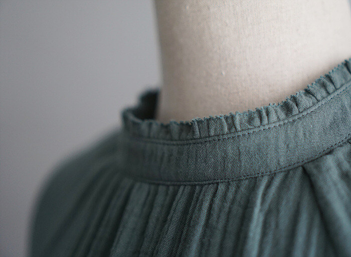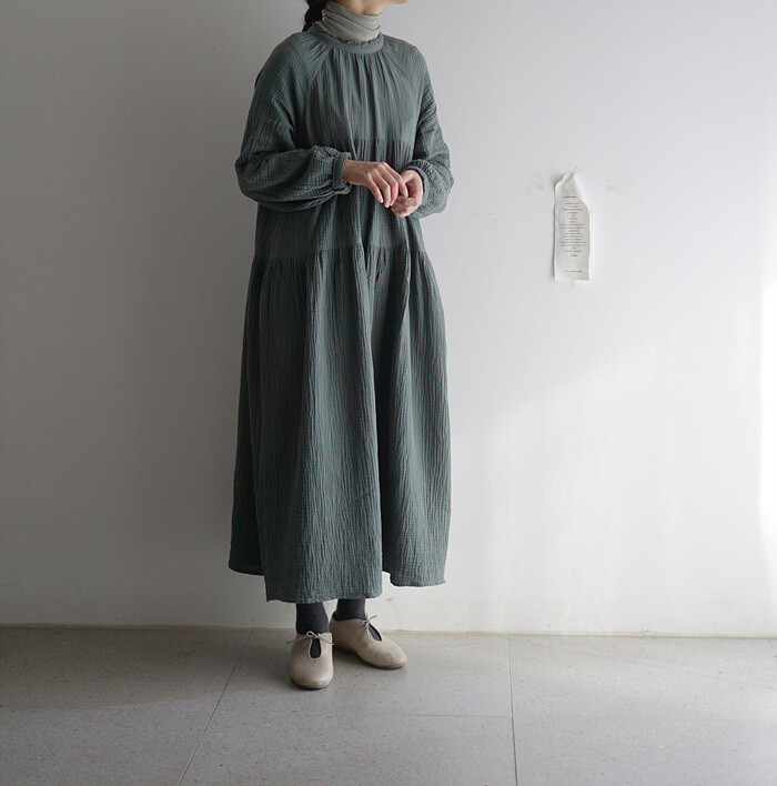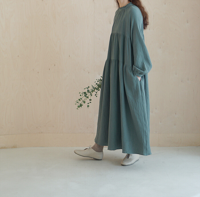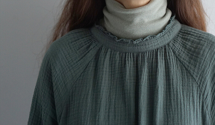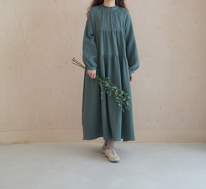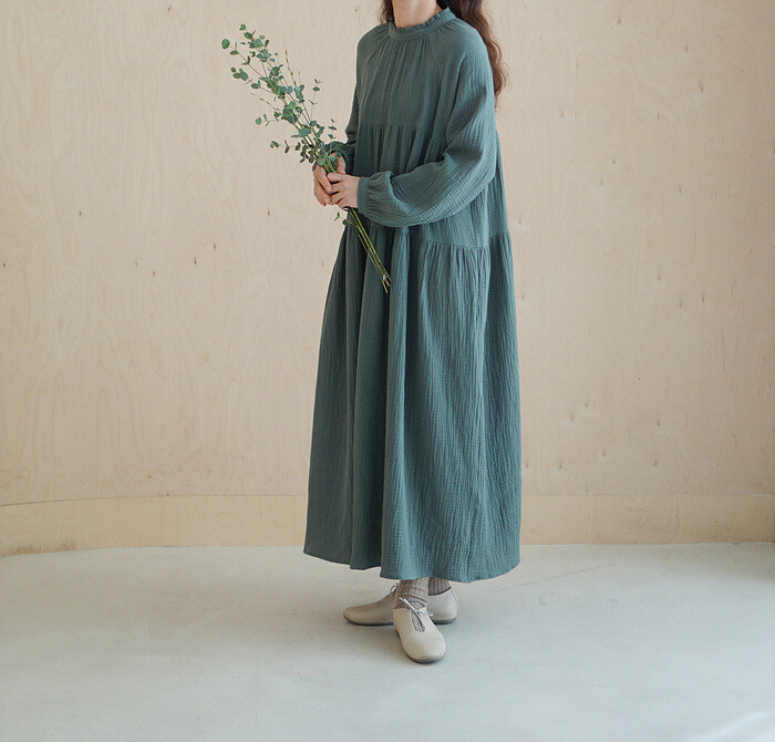 풍성한 셔링이 만드는 트라페즈 실루엣.