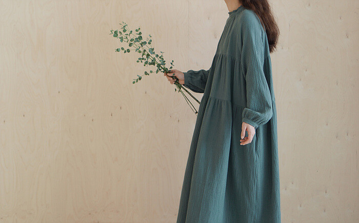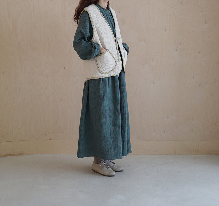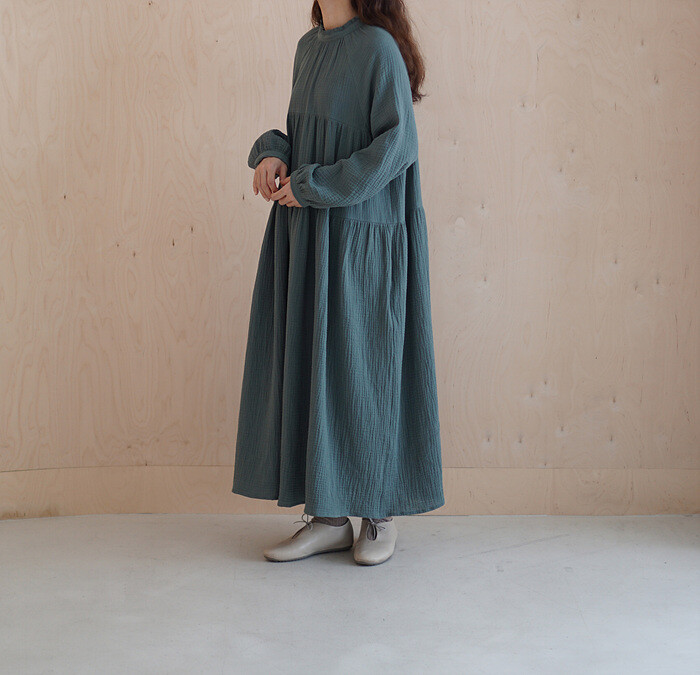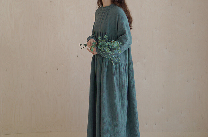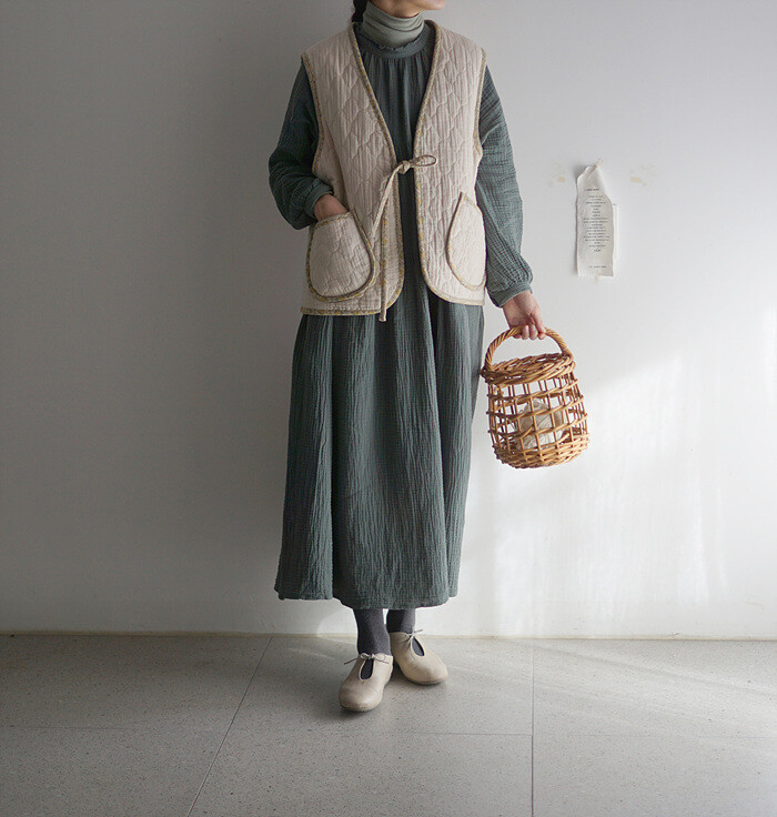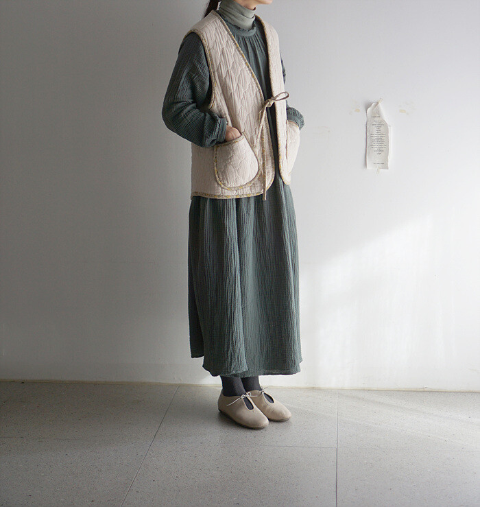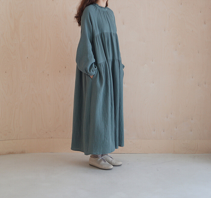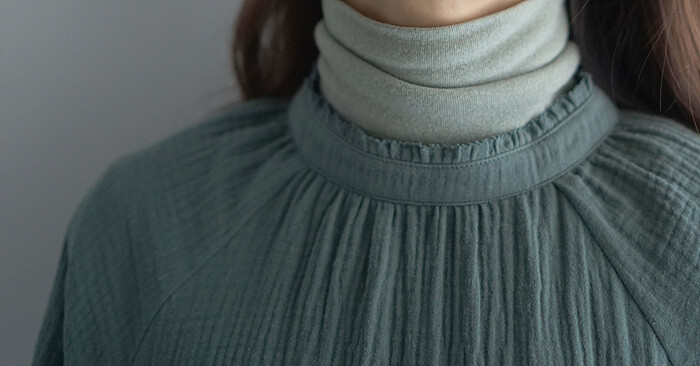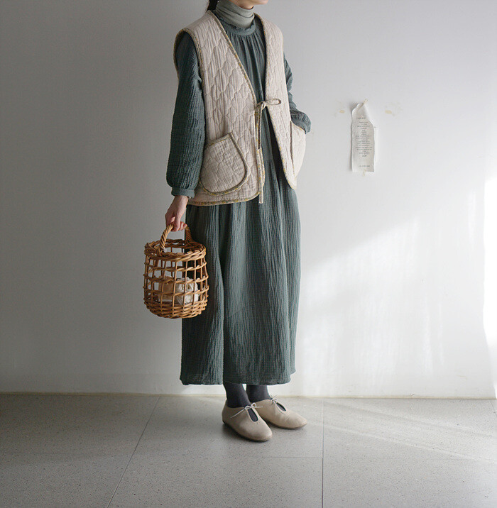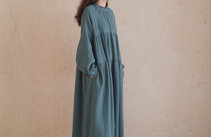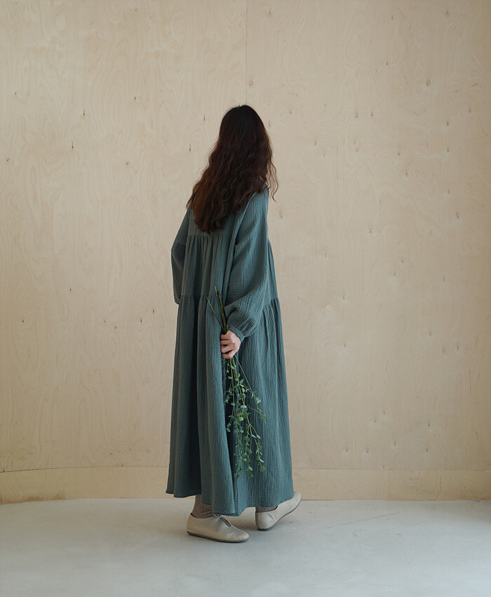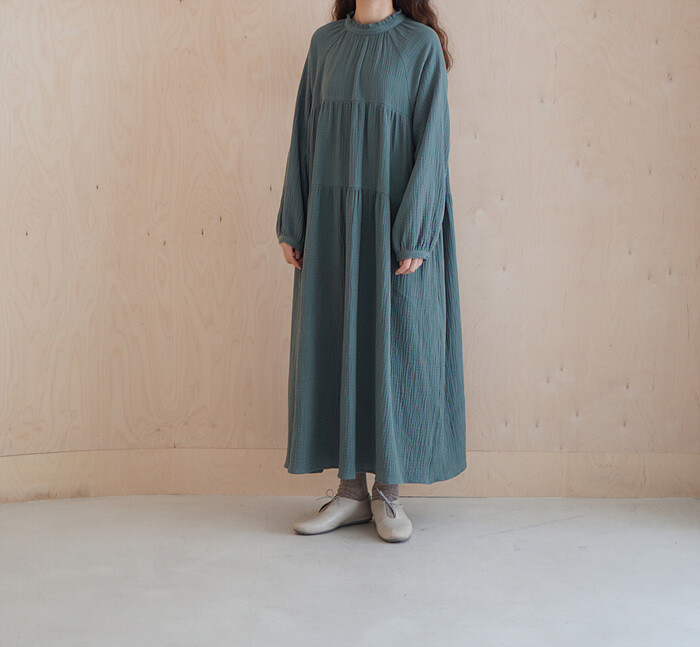 풍성한 셔링이 만드는 트라페즈 실루엣.