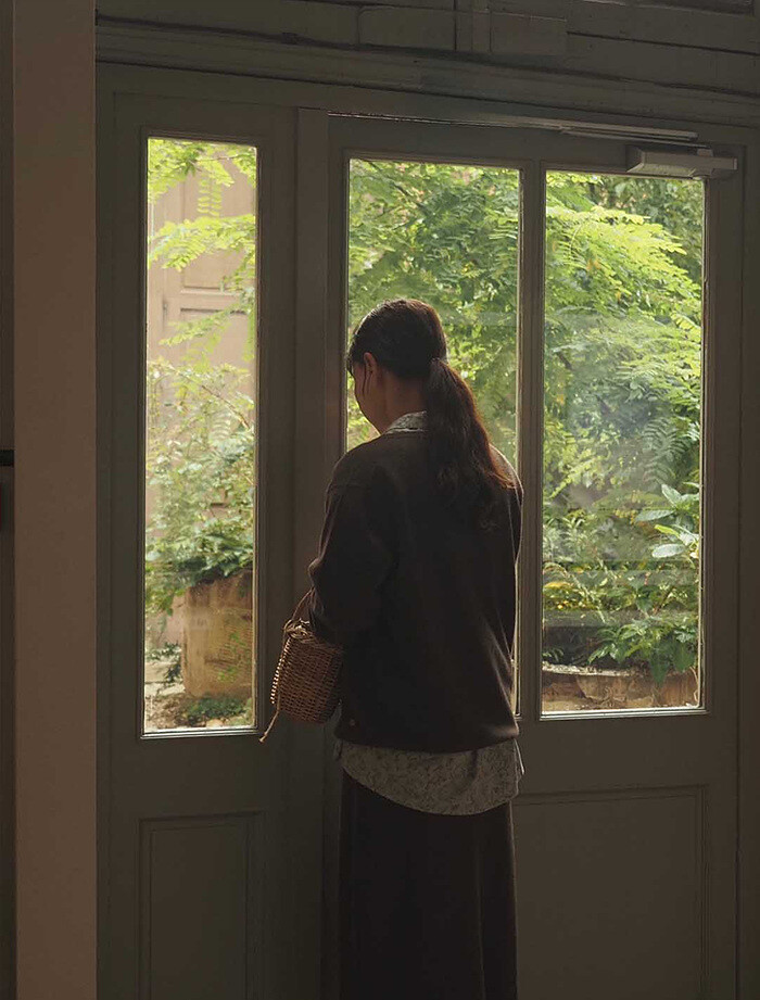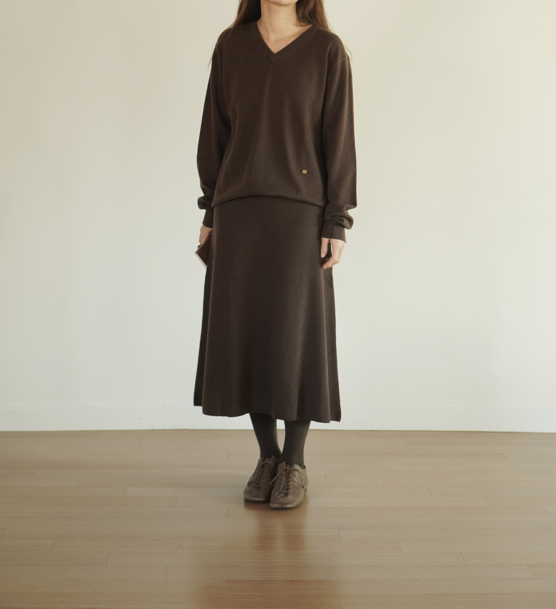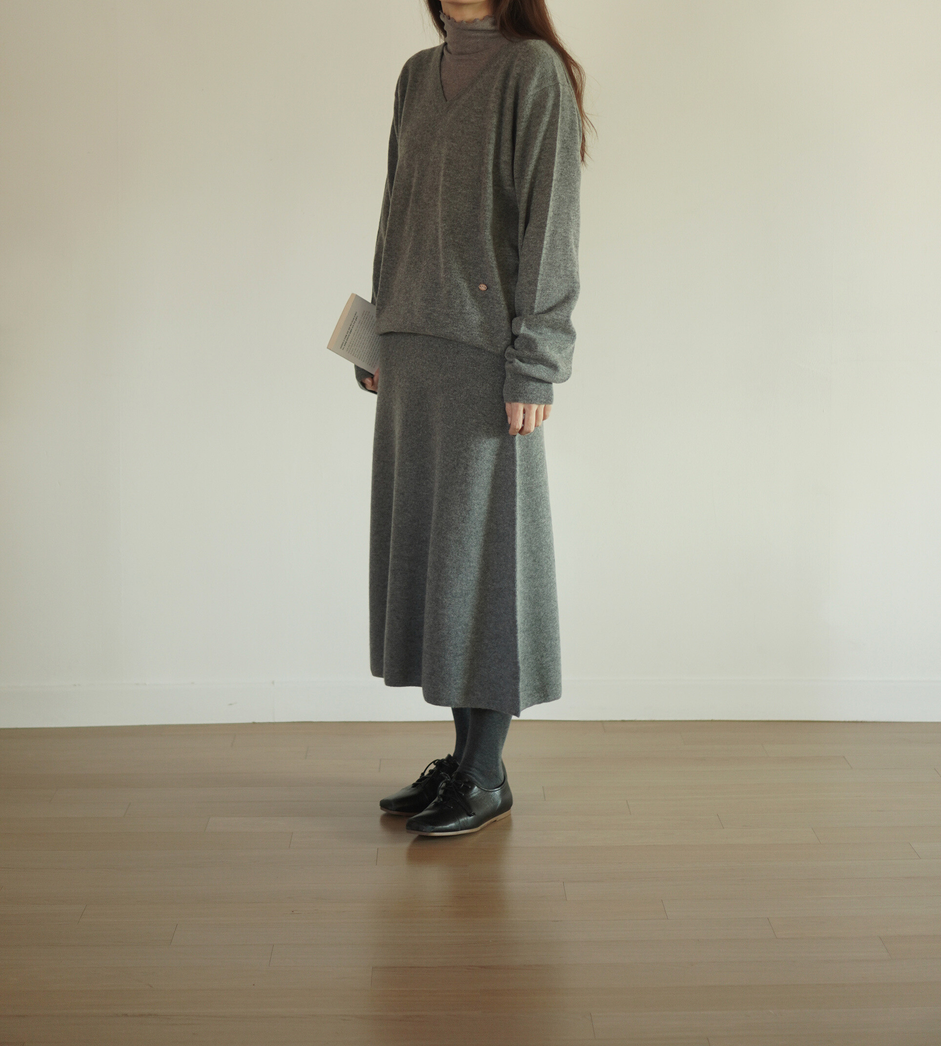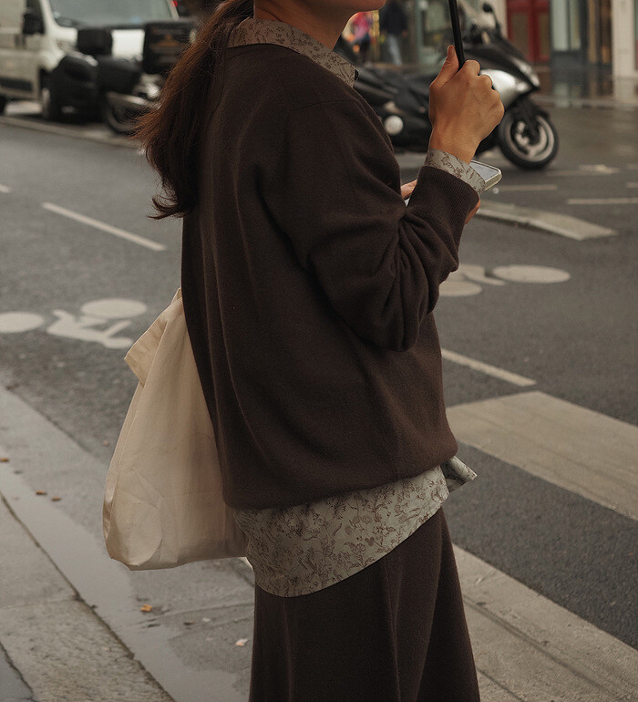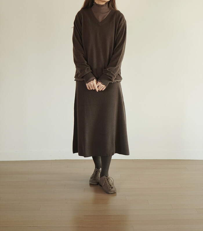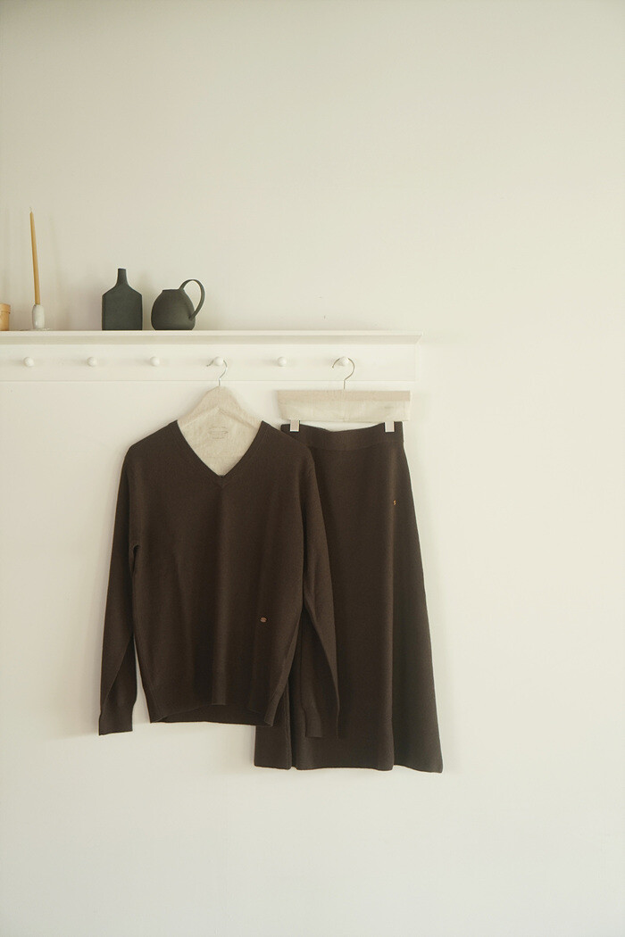 같은 원사 & 조직으로 만든 v넥 니트와 셋업으로도 연출이 가능합니다.