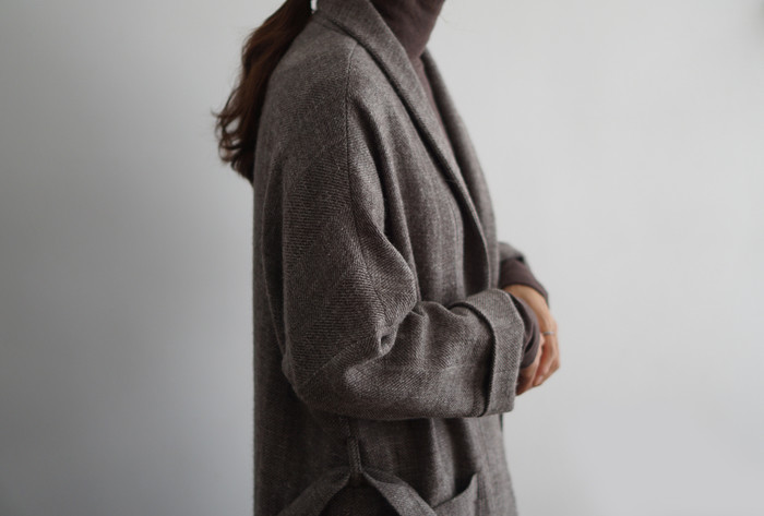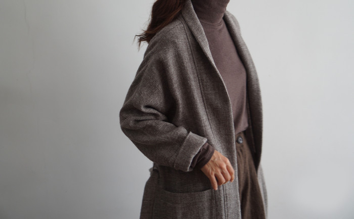 로브스타일의 숄칼라가 부착된 롱자켓이예요.