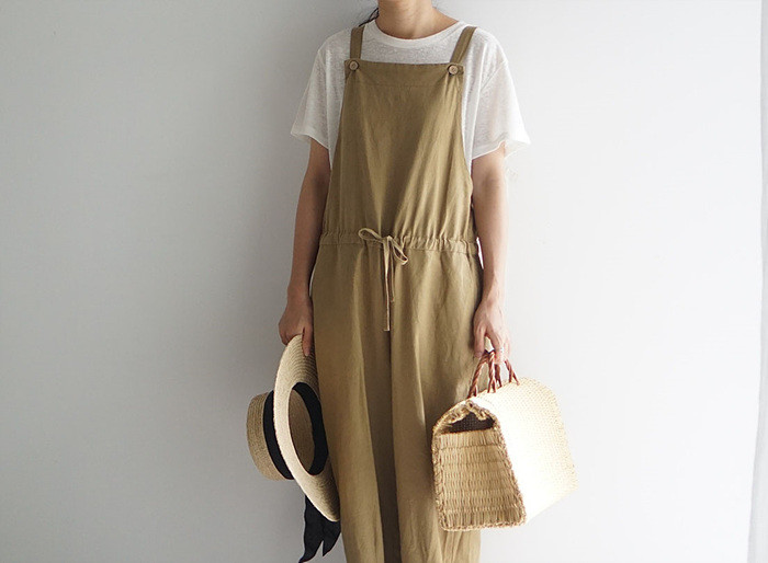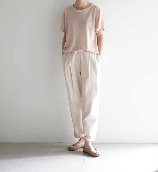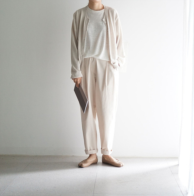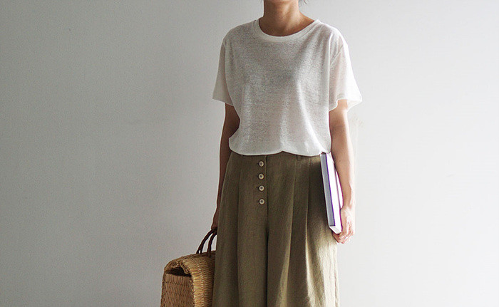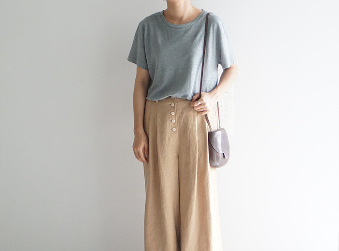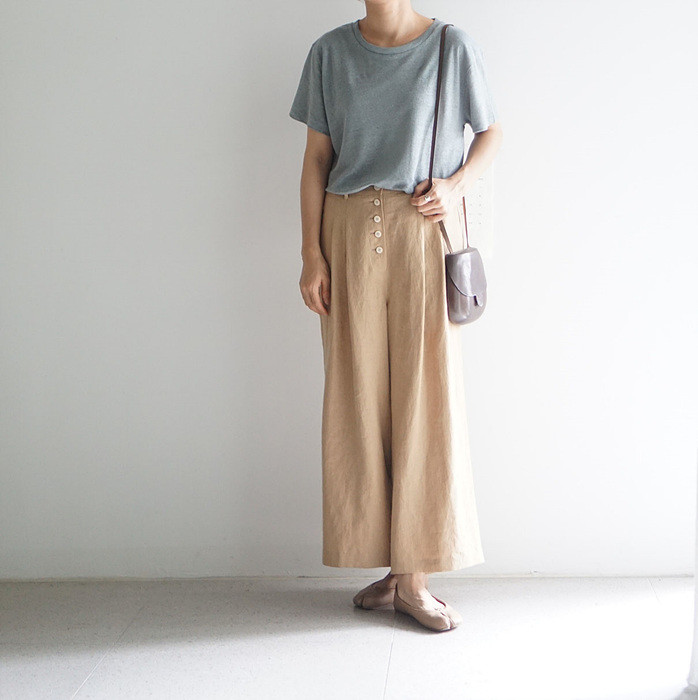 베이지색의 린넨 와이드 팬츠와 함께.