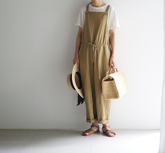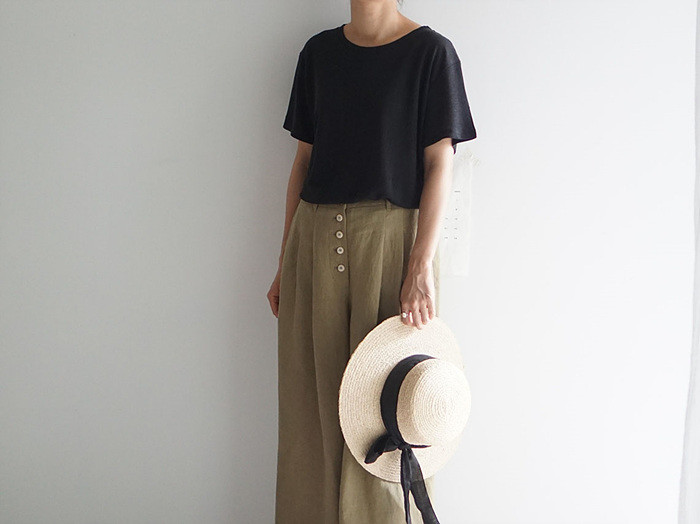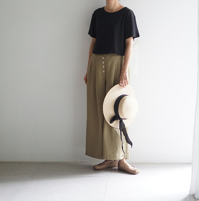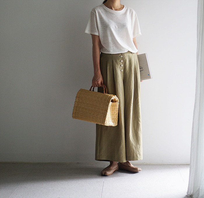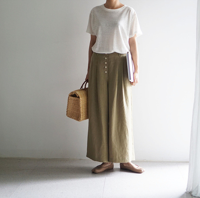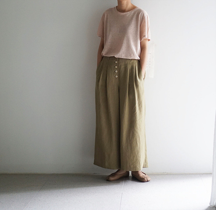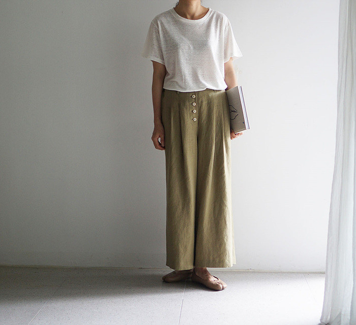 올리브색의 린넨 와이드 팬츠와 함께.